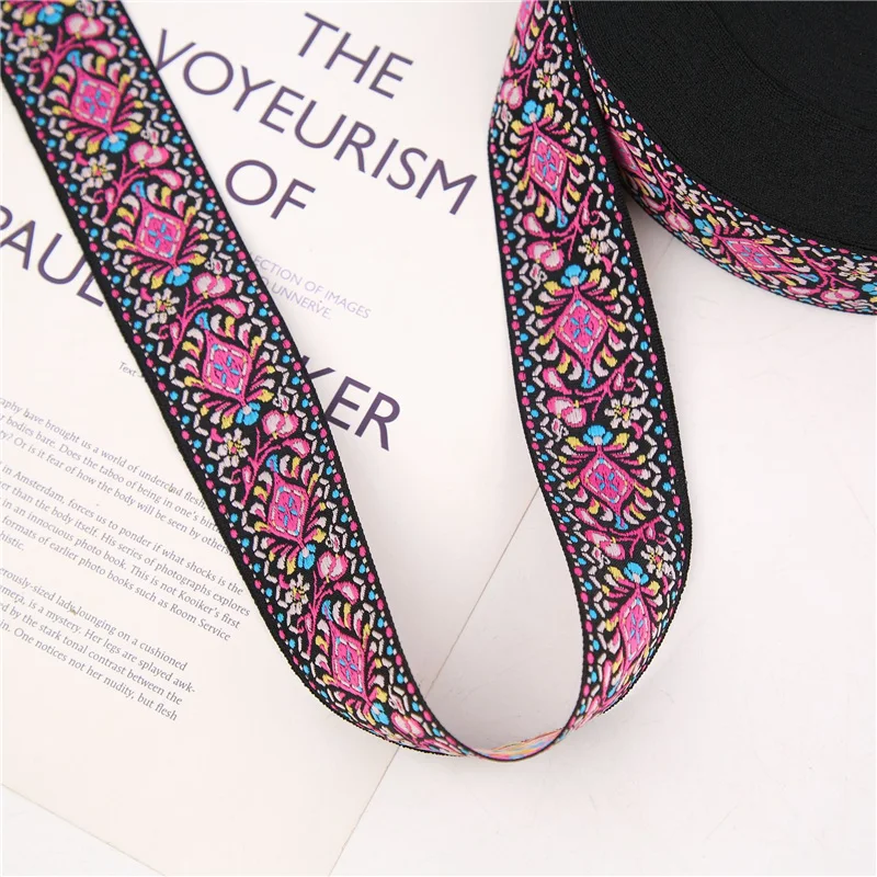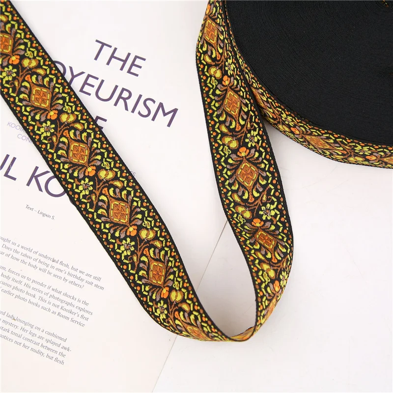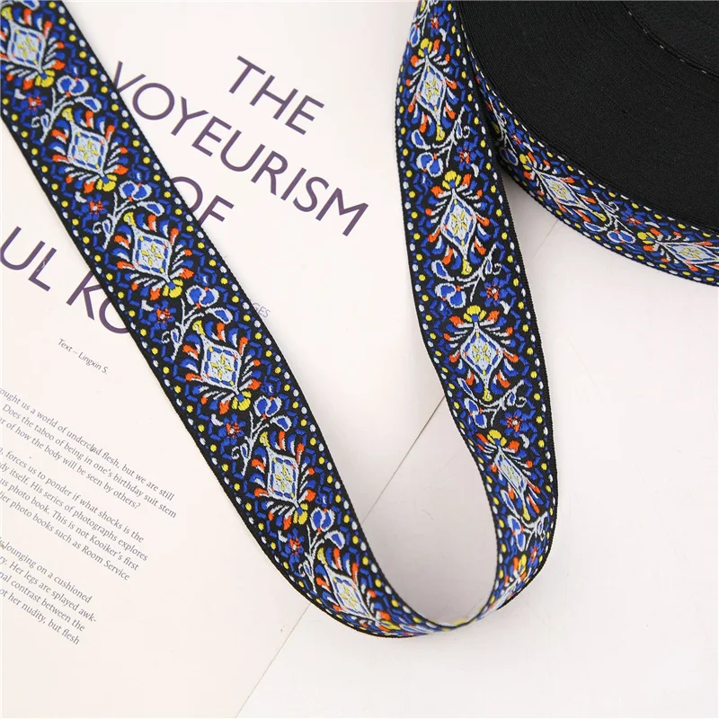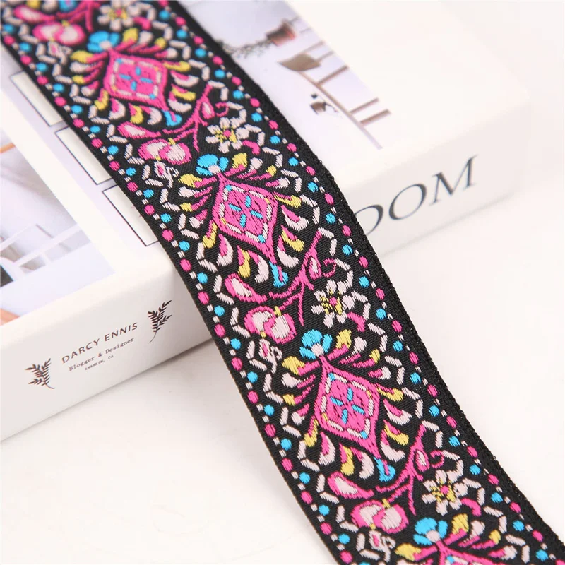 Introducing a stunning set of three woven jacquard ribbons, each measuring 40mm (1.5″) in width and available in vibrant colors that evoke a vintage charm. The left ribbon features an elegant black background adorned with intricate pink and light blue floral patterns, complemented by leafy green elements. The middle ribbon showcases a bright red base with harmonious floral and geometric designs in blue and white, perfect for adding a touch of classic style to your crafts. Finally, the right ribbon, also black, is embellished with rich earthy tones of orange, yellow, and green, enhancing its floral motifs. Ideal for guitar straps, decorative belts, or any DIY project, these ribbons are durable, made from eco-friendly polyester and cotton materials.