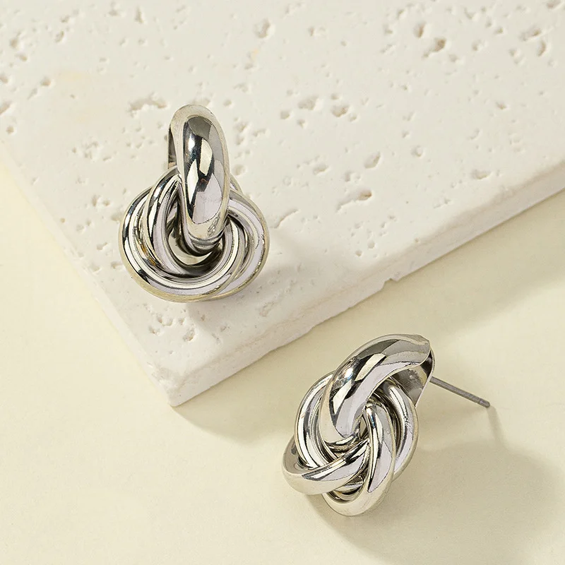- Design features a small top hoop, with layered, interconnected rings forming a knot-like cluster that creates a sense of depth and graceful movement, adding visual intrigue and elegance.