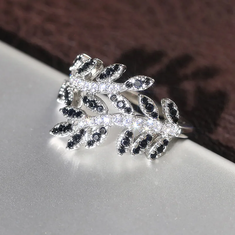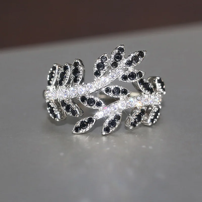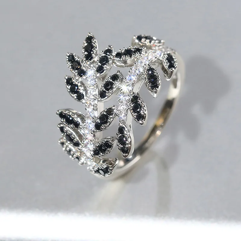 - Decorated with black and white cubic zirconia stones to create a striking contrast, emphasizing the natural leaf shape with sparkling accents.