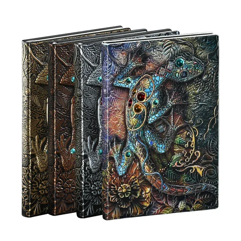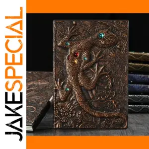 Discover a truly unique and luxurious accessory that elevates your writing experience. This vintage notebook features a richly textured leather cover with a detailed, three-dimensional embossing of a gecko climbing on a branch, surrounded by intricate foliage patterns. The cover’s embossed design is accented with colorful rounded gems in shades of red, gold, and blue, creating a vibrant contrast against the bronze, silver, or green bronze tones. Crafted from imported leather mounted on sturdy gray board, this handcrafted piece exudes artistic elegance and tactile appeal. Measuring approximately 21.5 x 14.5 cm, it’s perfect for use in the office, studio, or as a stylish gift for enthusiasts of fine craftsmanship and vintage aesthetics. Picture yourself jotting down your thoughts with this striking, handcrafted notebook—an enduring symbol of artistic refinement.