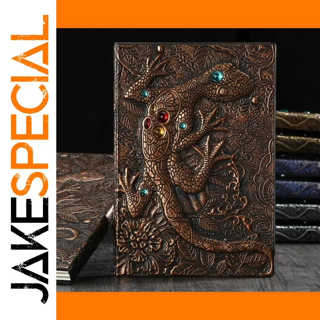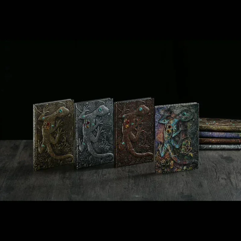 - This handcrafted notebook features a luxurious leather cover measuring 21.5 x 14.5 cm, featuring an intricate 3D embossed gecko design with vivid gem accents in red, gold, and turquoise shades.
