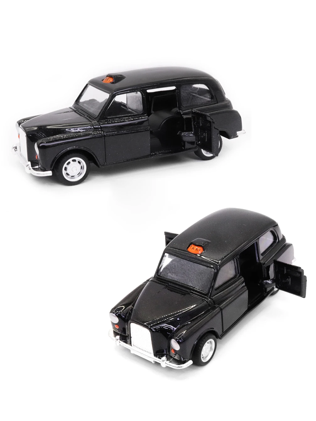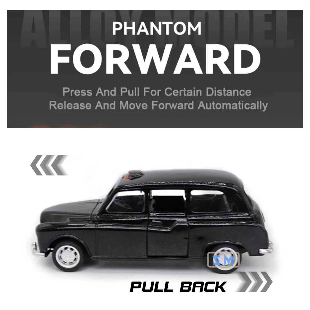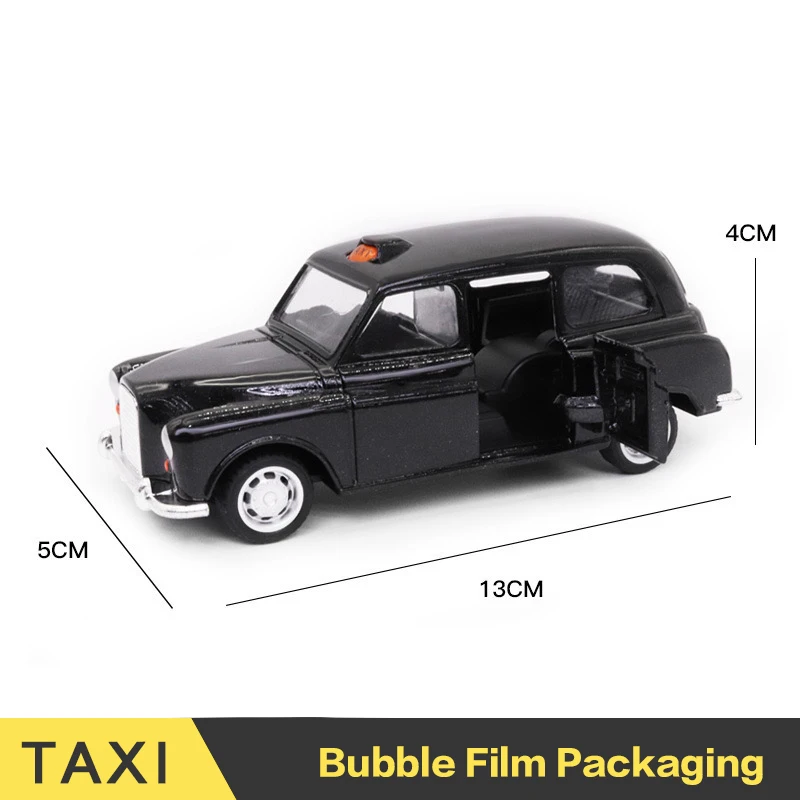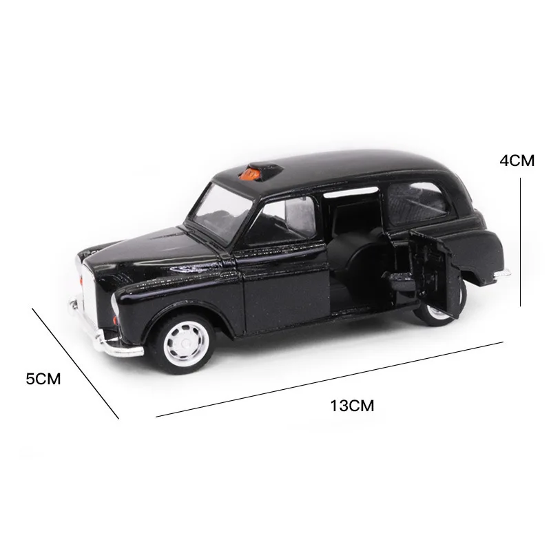 Immerse yourself in nostalgic charm with this 1:36 scale diecast miniature of a vintage London Taxi, measuring 13 cm long, 5 cm wide, and 4 cm high. Crafted from alloy and plastic, it features finely detailed design elements like a shiny black finish, a silver mesh front grille, chrome bumpers, circular headlights, and transparent windows revealing an interior. The model includes functional openable doors and operates as a pull-back vehicle for smooth motion. Perfect for collectors and enthusiasts, it also serves as an elegant decoration or creative gift. Suitable for ages 3 and up, this sturdy, battery-free miniature embodies classic elegance and realistic craftsmanship in every detail.