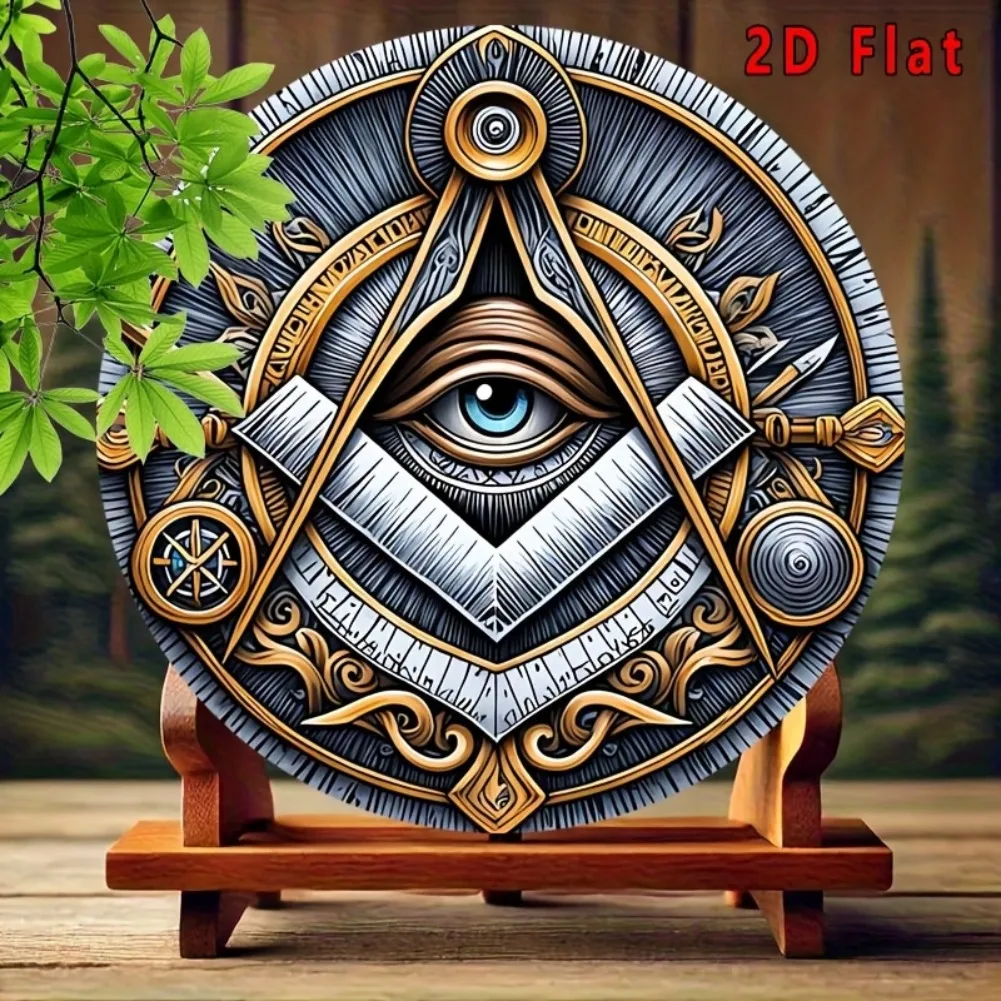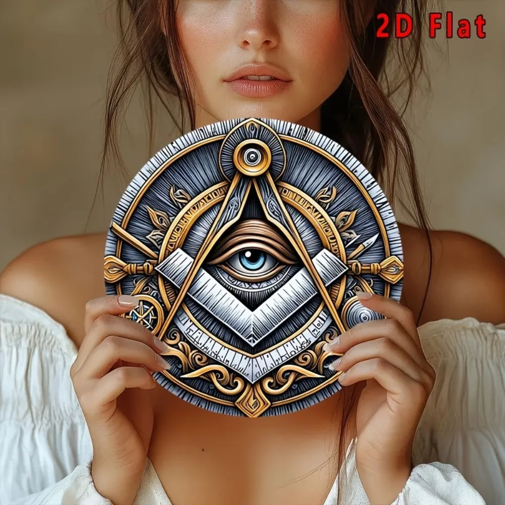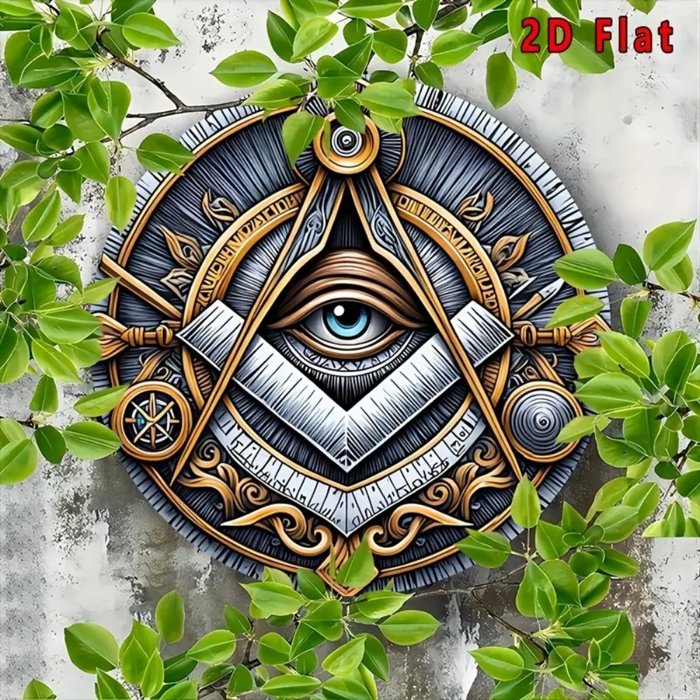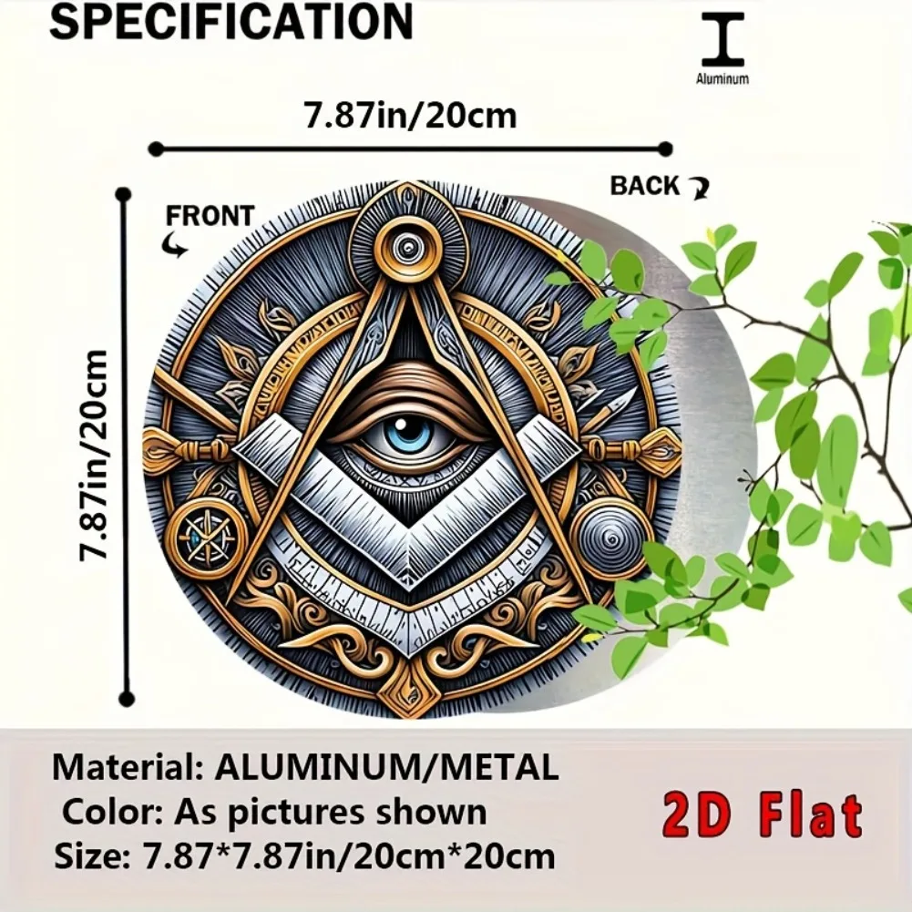 Enhance your space with this 20x20cm vintage-style wall art featuring a colorful, intricate design on a durable aluminum tin surface. The piece showcases a detailed, lightly three-dimensional eye at the center, surrounded by symbolic motifs in shades of gold, black, and silver/white, creating a striking contrast. Its vintage aesthetic combines luminous metallic finishes with fine line work, evoking a mystical and decorative ambiance. Designed with four pre-drilled holes for easy wall mounting using nails or double-sided tape, this versatile art can also be placed on tabletops or in displays. Perfect for homes, bars, restaurants, offices, shops, or garages, adding a charming, collectible touch to any environment.