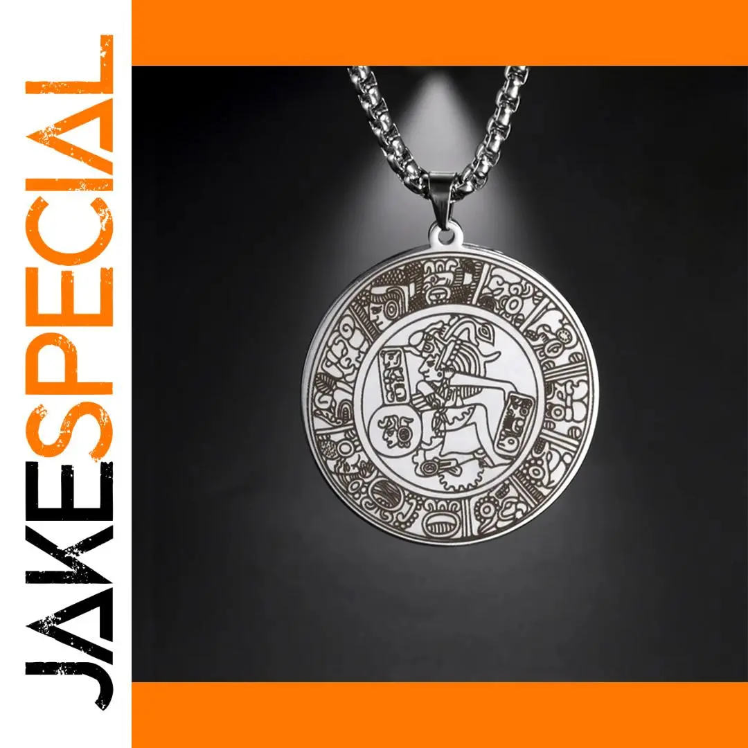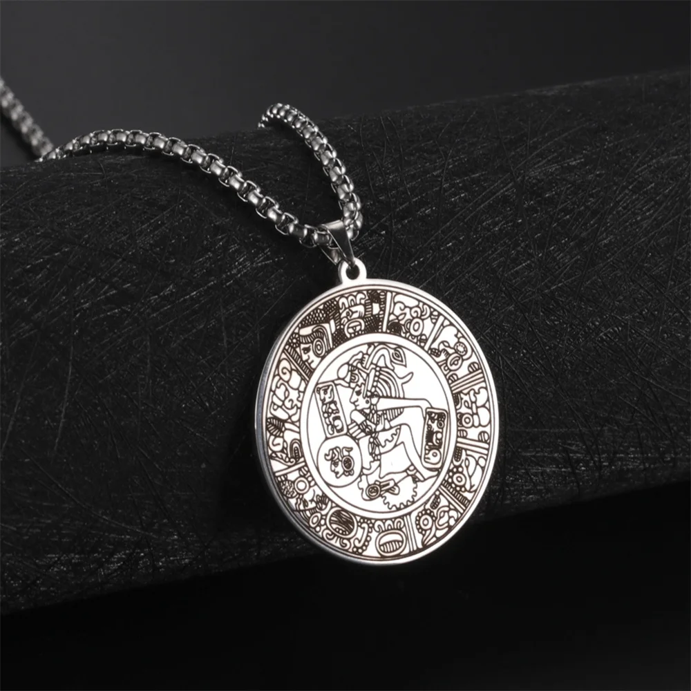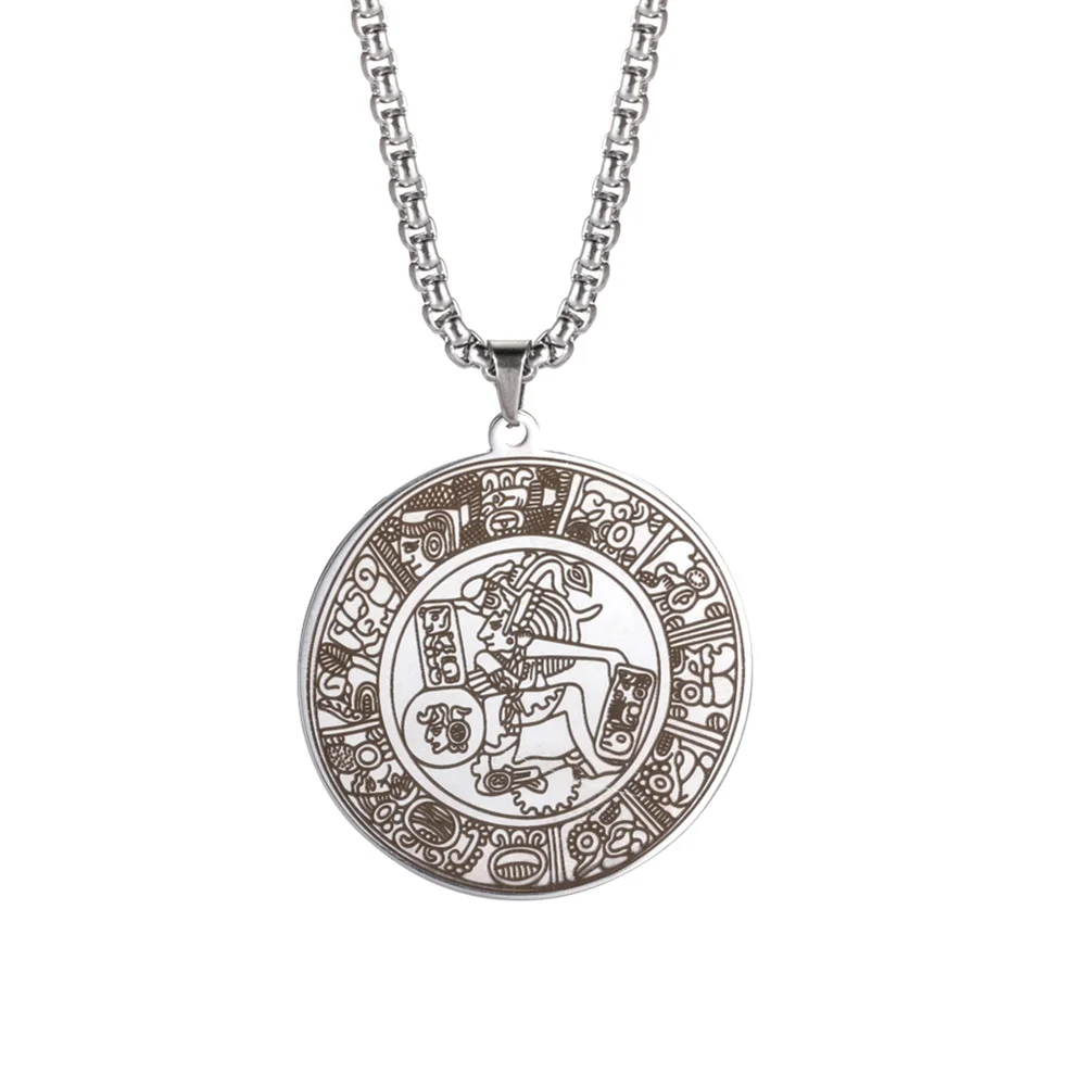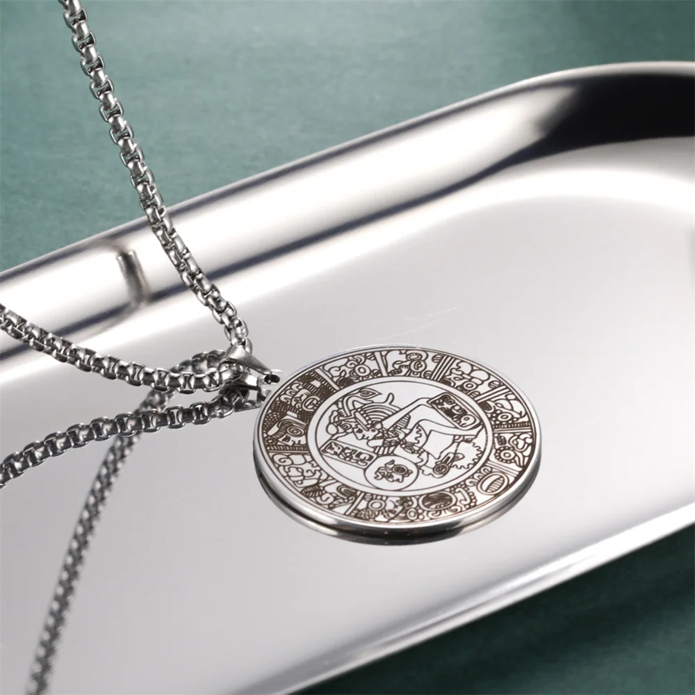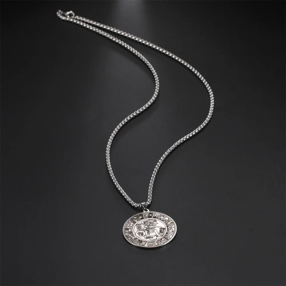 Experience the unique allure of this vintage men's Mayan circle pendant necklace, crafted from durable stainless steel with a sleek silver finish. Measuring 35x38mm, the pendant features intricate engravings inspired by ancient Mayan hieroglyphs, depicting stylized mythological figures with ornate headdresses. The detailed glyph-like patterns and decorative motifs around the border give the piece a textured, vintage look that exudes cultural richness and craftsmanship. The 60cm link chain complements the pendant perfectly, offering a comfortable fit for various occasions. Whether you're attending a party, celebrating a special event, or adding a distinctive touch to your everyday look, this necklace blends ethnic elegance with modern style, making it a memorable accessory.