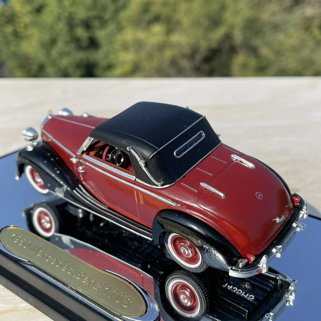 Imagine owning this beautifully crafted miniature of a vintage Mercedes car, perfectly capturing timeless elegance and classic design. With its deep, rich red color complemented by black fenders and a matte black roof, it exudes sophistication. The glossy finish highlights intricate chrome accents on the grille, headlamps, and side trim, bringing out the vehicle’s vintage charm. Designed with meticulous attention to detail, this scale model boasts realistic proportions, chrome door handles, side mirrors, and finely treaded black tires. Whether displayed on a desk or in a collection, this model offers a nostalgic touch that elevates any space, making you feel connected to the golden era of automobile design.