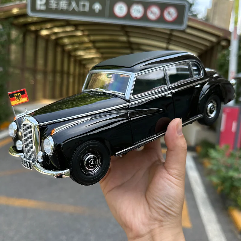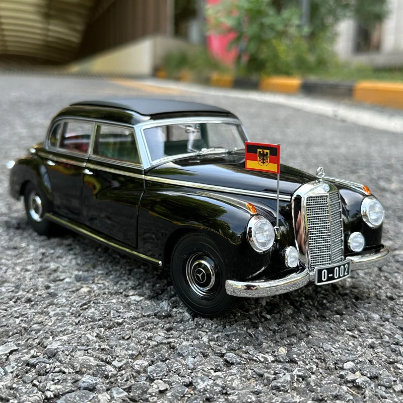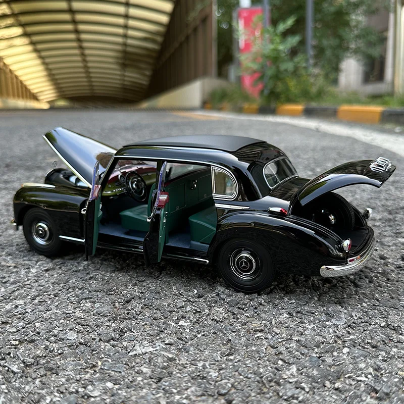 Experience the timeless elegance of the Mercedes-Benz 300s W186 Initial S-class Premier with this meticulously crafted 1:18 scale diecast model. Finished in a sleek, glossy black alloy, the model features authentic vintage design elements, including a prominent vertical grille, rounded headlights, curved roofline, and detailed hubcaps with the Mercedes-Benz emblem. Openable doors reveal a green interior with intricate detailing, while transparent windows showcase the craftsmanship. Made of durable metal, this model is ideal for collectors aged 14 and above and captures the classic charm of early 20th-century luxury sedans, making it a perfect addition to any vintage car collection.