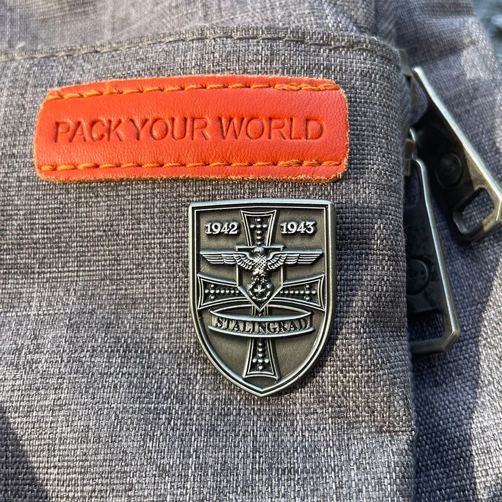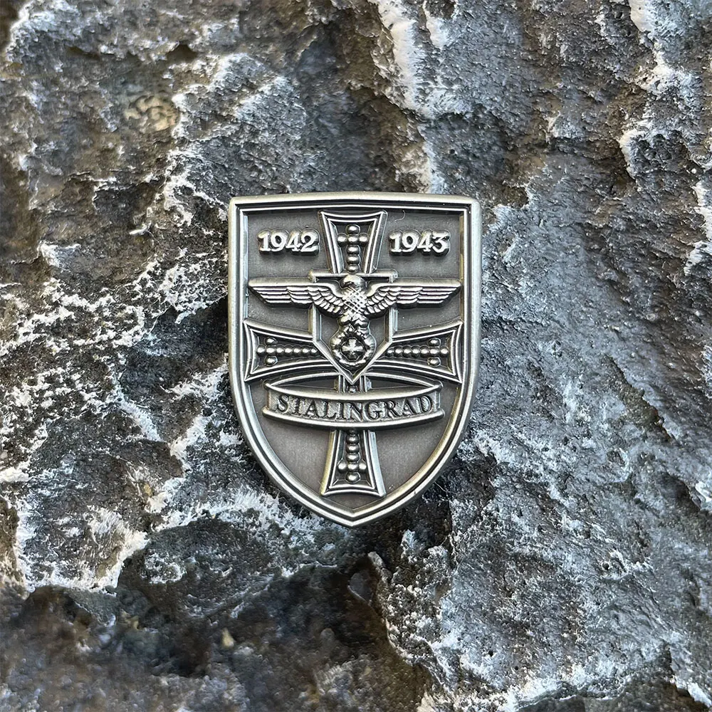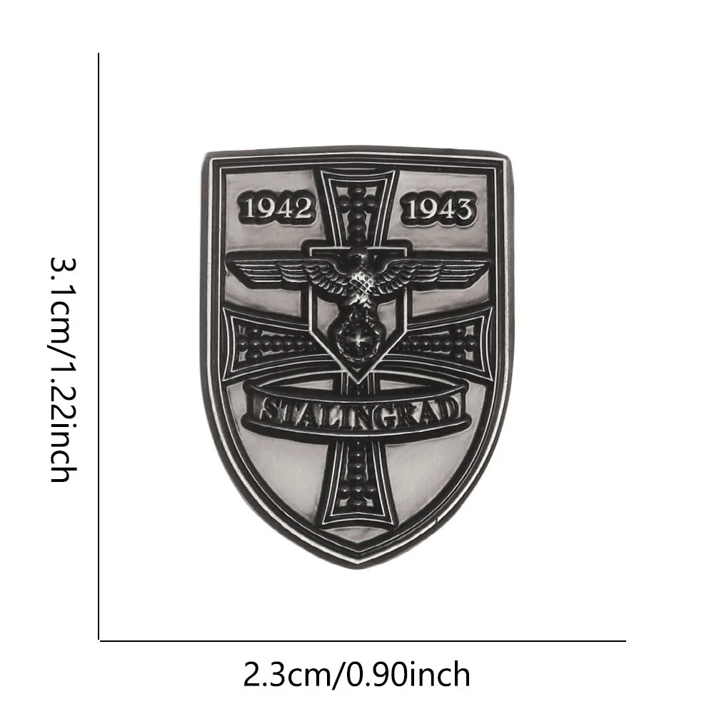 Step into history with this striking metal badge, inspired by European military symbolism from World War II. Crafted with a sleek silver or gunmetal finish, it features intricate engravings of an eagle clutching a circular emblem marked with a swastika. The badge's shield-shaped design exudes a nostalgic, retro aesthetic, complemented by detailed decorative elements like a cross and flowing ribbon inscribed with “STALINGRAD.” The top section displays the years “1942” and “1943,” adding historical authenticity. Measuring as part of a butterfly buckle pin or badge, this piece is perfect for collectors and enthusiasts who appreciate detailed craftsmanship and historical motifs. Imagine owning a unique relic with rich symbolism and timeless appeal, ideal for decoration or crafting projects.