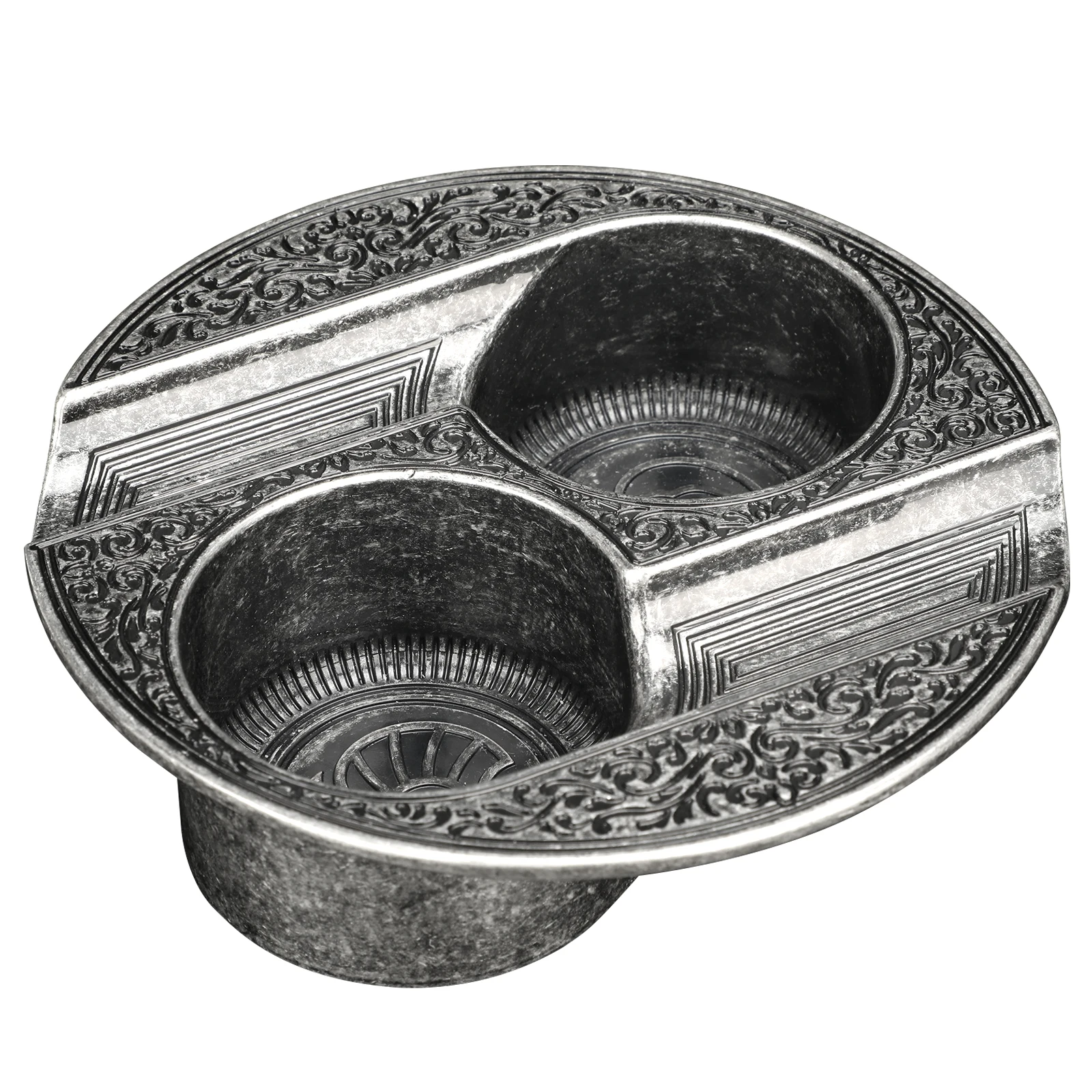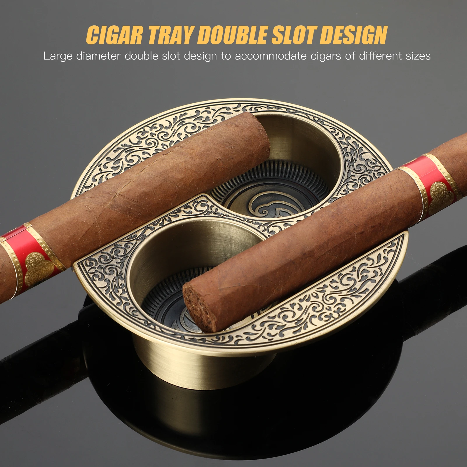 Discover the timeless elegance of this vintage-style metal cigar ashtray, designed to elevate your smoking experience. Crafted from high-quality zinc alloy, it features intricate black decorative patterns along the edges, reminiscent of ornate floral or scroll motifs, enhancing its antique charm. The smooth, polished top surface highlights fine craftsmanship, while two evenly spaced, slightly raised slots provide secure resting places for your cigars. Its round shape ensures convenience whether you're indoors or outdoors, and the black ribbed interior lining of the slots offers extra grip and protection from ash spills. Compact and lightweight, this ashtray fits seamlessly on small tables or desktops, making it a stylish yet practical accessory for cigar enthusiasts who appreciate quality and luxury.