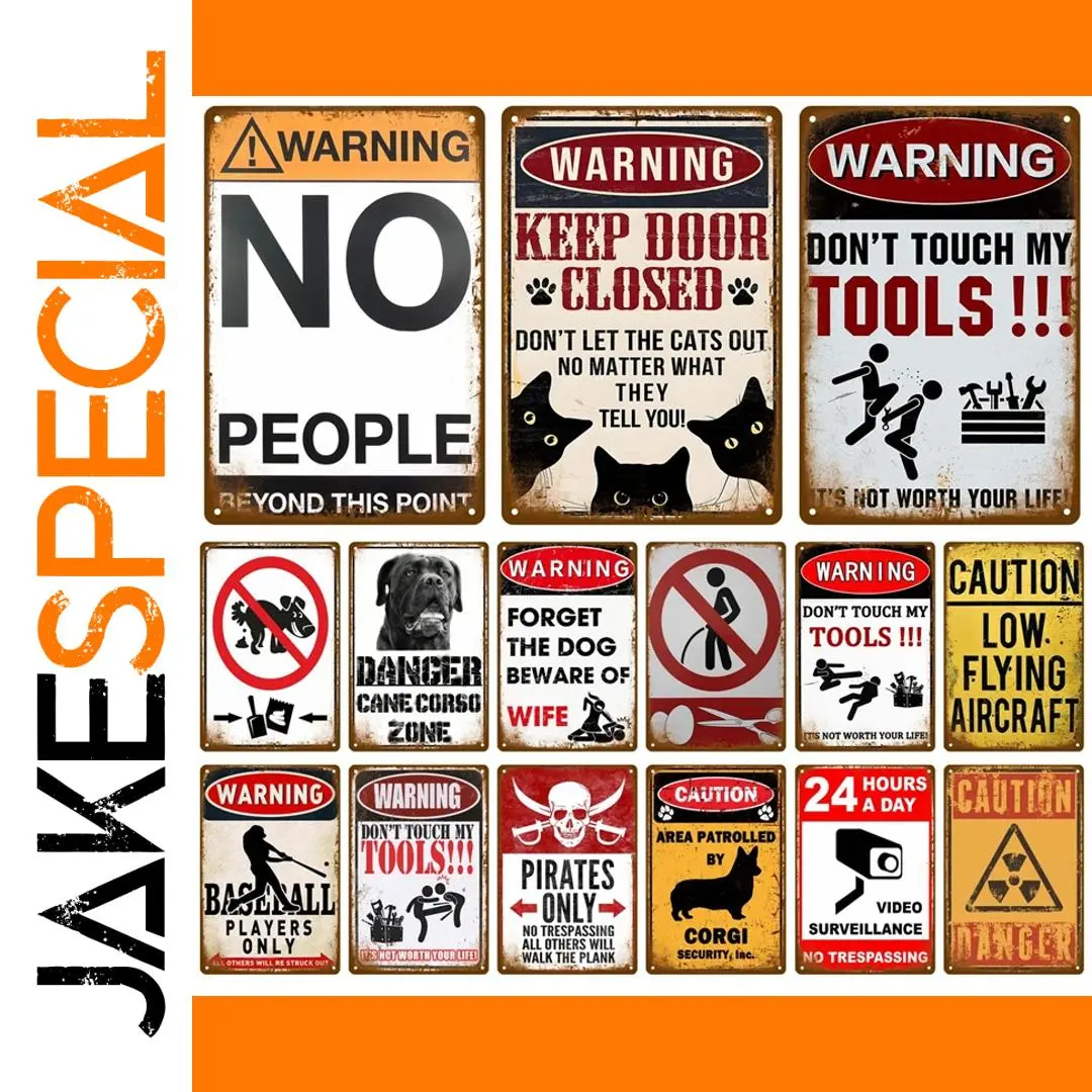 Transform your space with this eye-catching vintage-style metal warning sign, measuring 20cm x 30cm. Crafted from durable aluminum, it offers a rustic yet bold aesthetic perfect for indoor or outdoor display. Its distressed vintage finish and vivid color palette—including bright orange, deep burgundy, navy blue, and vibrant pink—add a nostalgic charm that enhances any bar, garage, café, or man cave. The sign features classic warning symbols like triangles and circles with slashes, paired with rugged typography and playful illustrations such as paw prints and icons, all designed to evoke a retro industrial vibe. Whether you want to bring character to your home or create an engaging ambiance for customers, this sign harmoniously combines durability and vintage appeal for lasting impact.