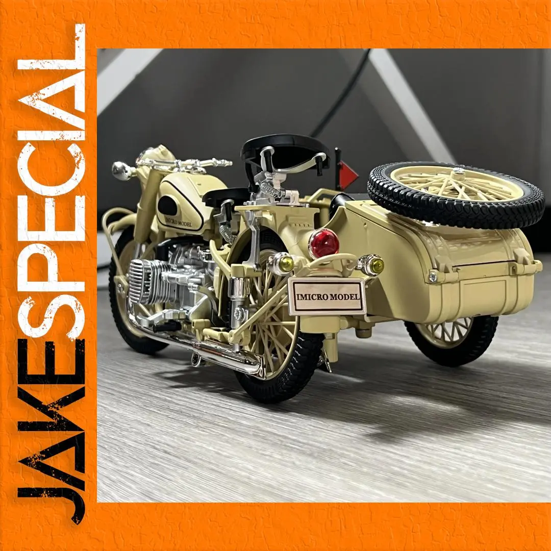 This diecast model of a vintage motorcycle with a sidecar features a classic military-themed design crafted with meticulous attention to detail. The model is presented in a light beige color with subtle accents that elevate its aesthetic appeal. Made from high-quality diecast metal, this model not only reflects durability but also showcases realistic features such as a visible engine with chrome details. The attached sidecar, also in beige, enhances the nostalgic feel with its spare wheel and small red flag. The intricate wheel design and realistic rear lights further contribute to its authenticity, making it a perfect ornament for collectors and motorcycle enthusiasts alike.