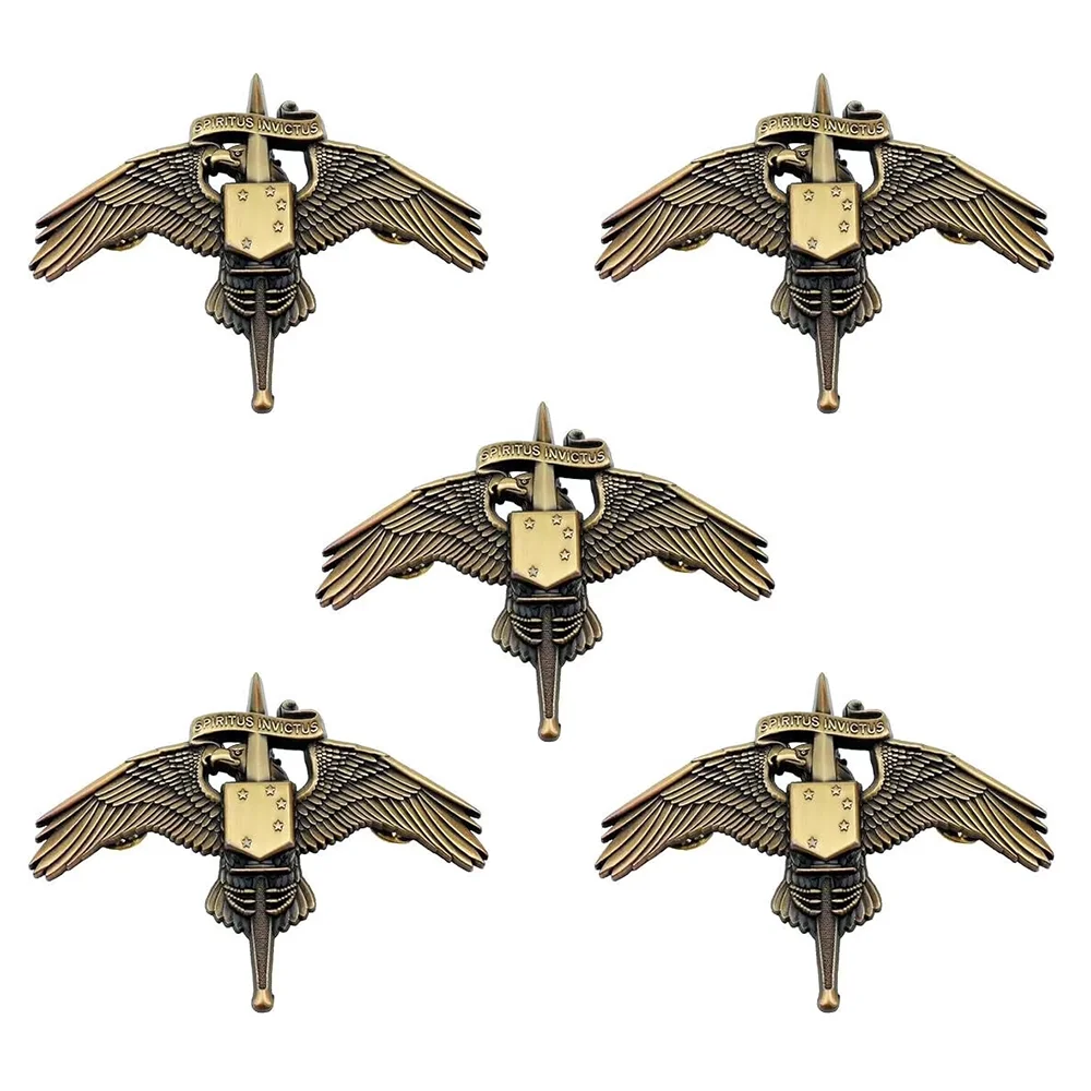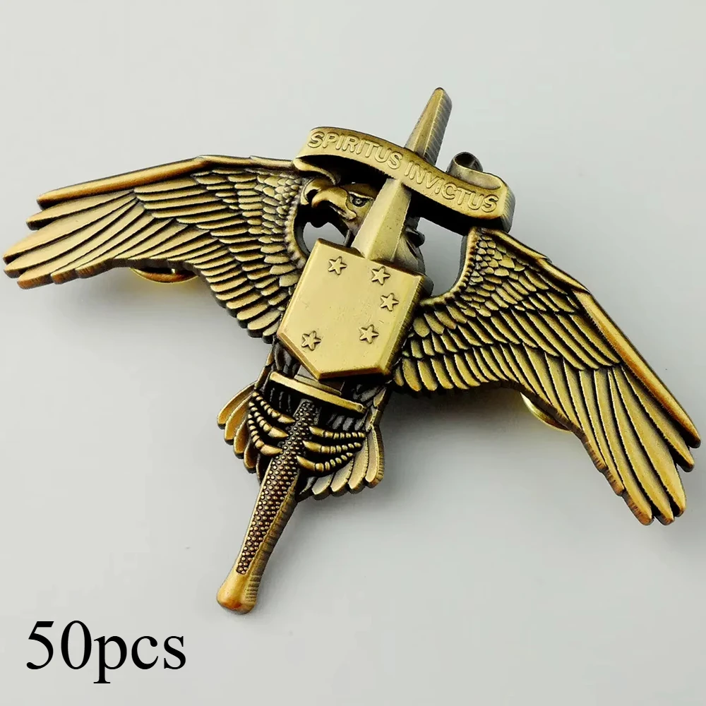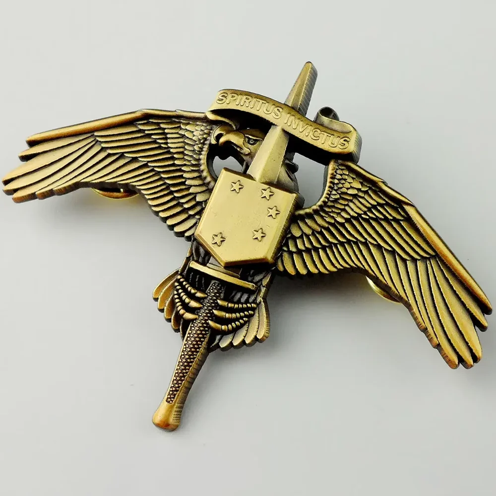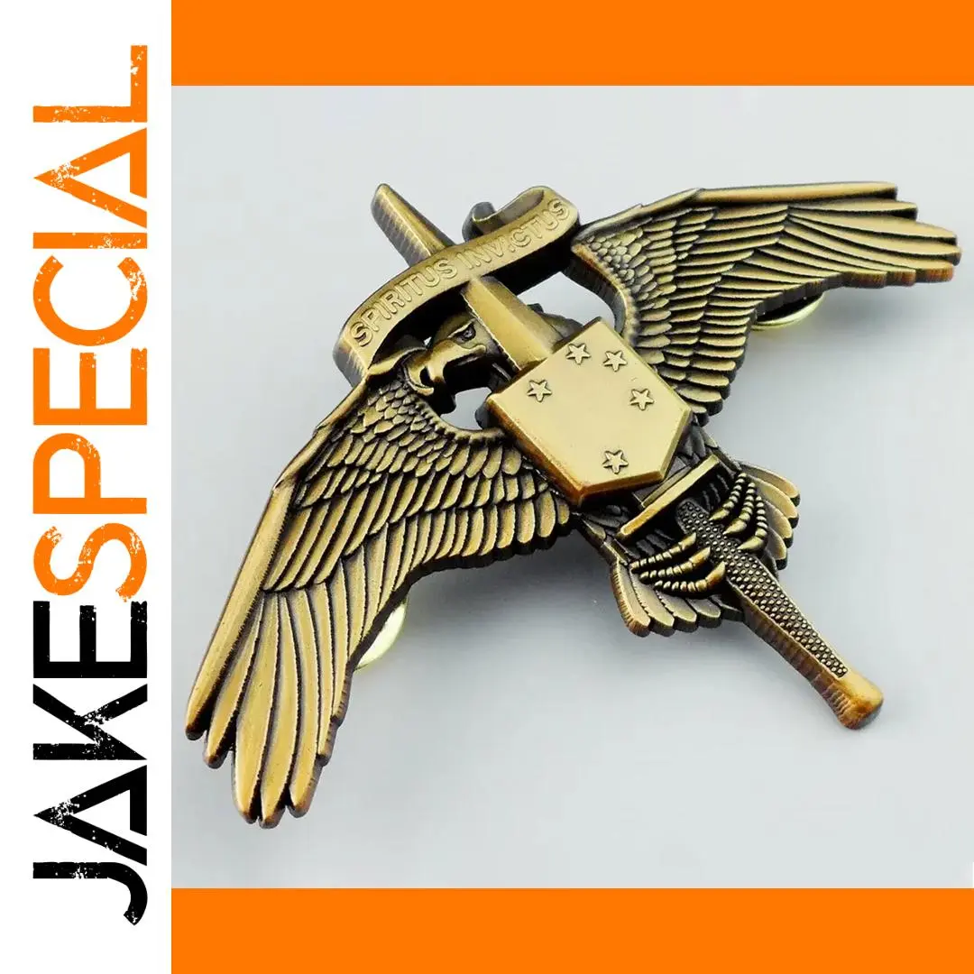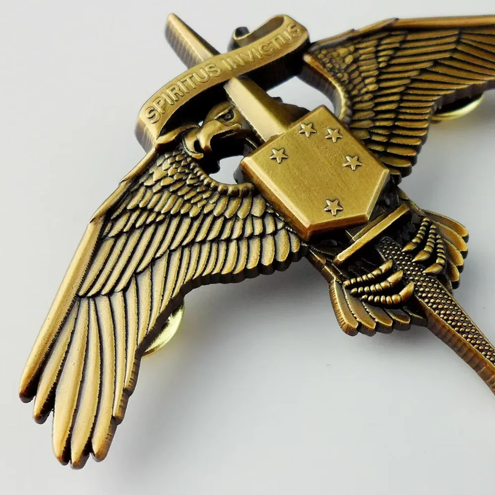 Imagine elevating your attire with this carefully crafted metal insignia, showcasing a vintage and nostalgic military style. Featuring a detailed bronze finish, the badge depicts a regal eagle with outstretched wings, clutching a sword, and adorned with a curved banner inscribed “SPIRITUS MUNUS.” The shield on the eagle's chest bears five evenly spaced stars, adding to its patriotic appeal. Behind the shield, a crossed sword adds depth and dimension to the design. This insignia’s textured feathers, aged finish, and intricate symbols truly capture the rugged essence of classic military craftsmanship. Perfect for collectors or enthusiasts, it’s designed to evoke pride and tradition while seamlessly attaching to your uniform for a distinguished look.