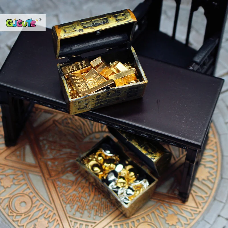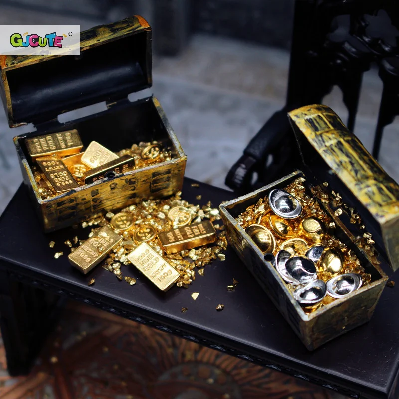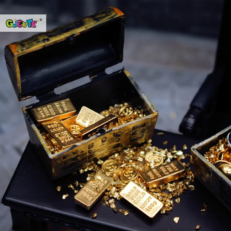 Imagine your dollhouse or collection enhanced with a stunning vintage treasure scene, adding charm and realism. This miniature gold ingot and chest set serves as a perfect accent, elevating your miniature world. Its exquisite craftsmanship and detailed design make it a captivating addition, inviting you to create stories and scenes full of treasure and history. Whether for display or collection, this set is a must-have for lovers of miniature art and craftsmanship. Elevate your display and enjoy a piece that reflects timeless elegance and detailed artistry, bringing your miniature universe to life.