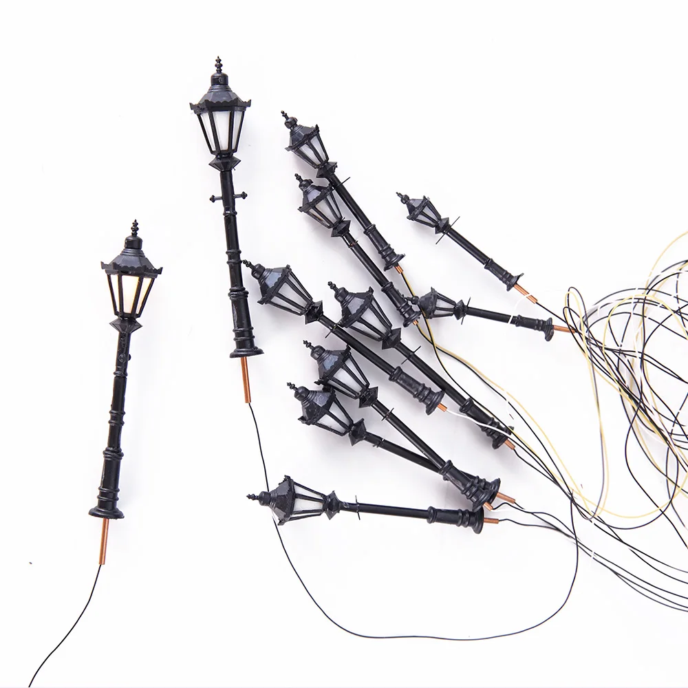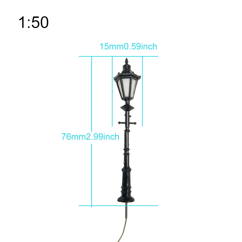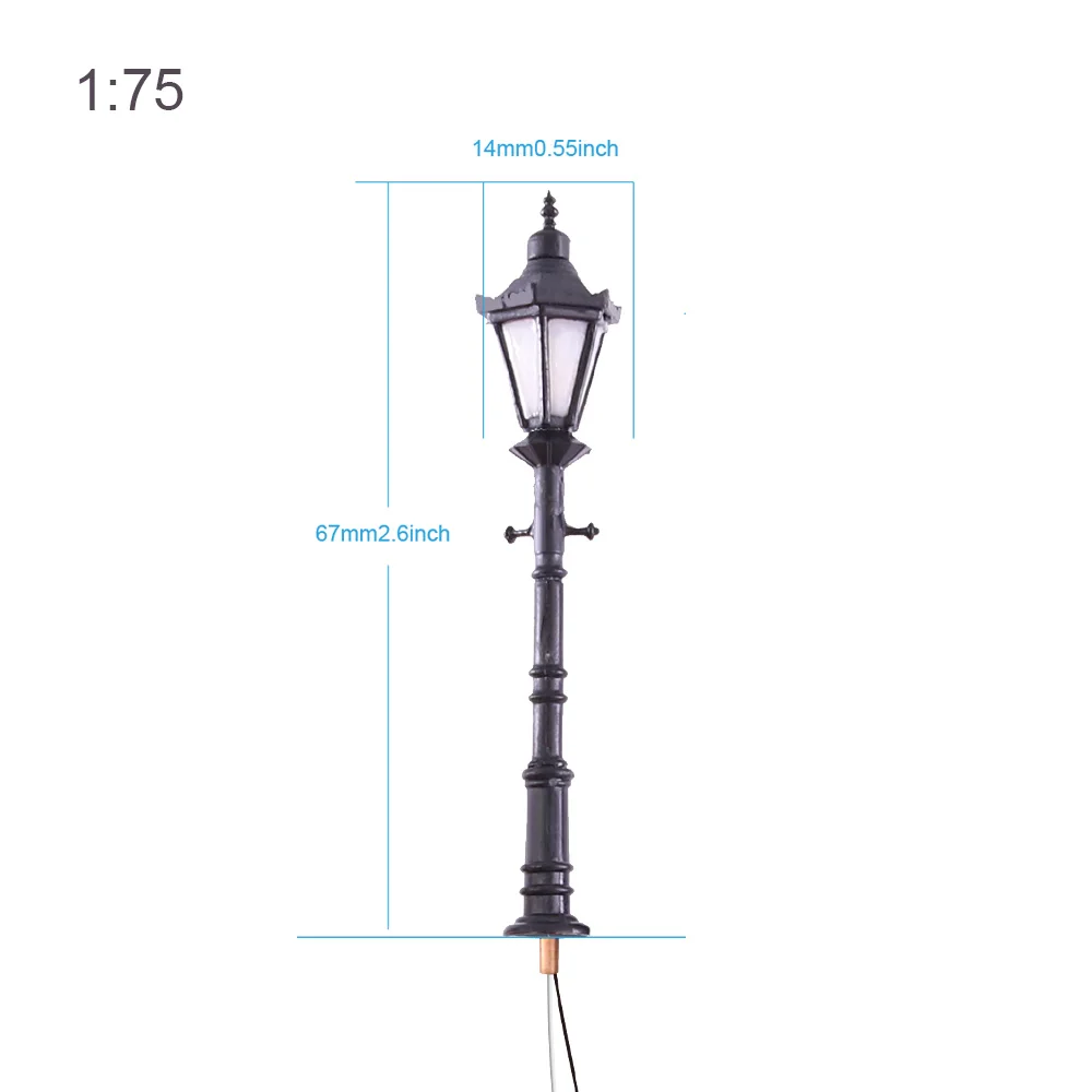 Enhance your miniature scenes with this set of six vintage-style LED street and garden lamps, compatible with sand tables, dioramas, and railway layouts. Crafted from durable ABS plastic, these 3V lamps feature warm lighting and come in six scales: 1:25 (87mm), 1:50 (76mm), 1:75 (67mm), 1:100 (53mm), 1:150 (43mm), and 1:200 (34mm). Their classic lantern-inspired design, with slender tapered bodies and pointed finials, provides a nostalgic, timeless streetlight aesthetic that adds refined detail to any model environment. Designed for adult hobbyists, these lamps are perfect for creating realistic, vintage-inspired miniature scenes.