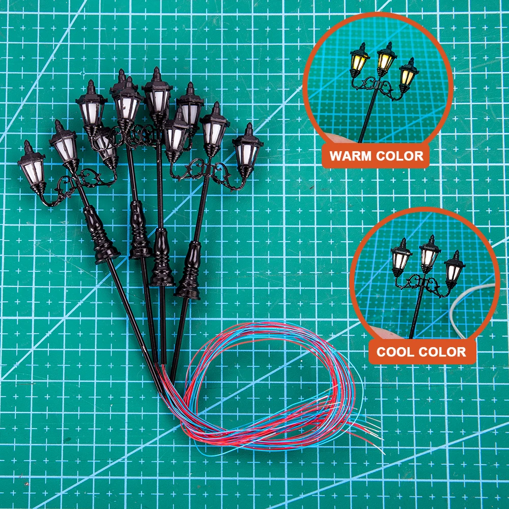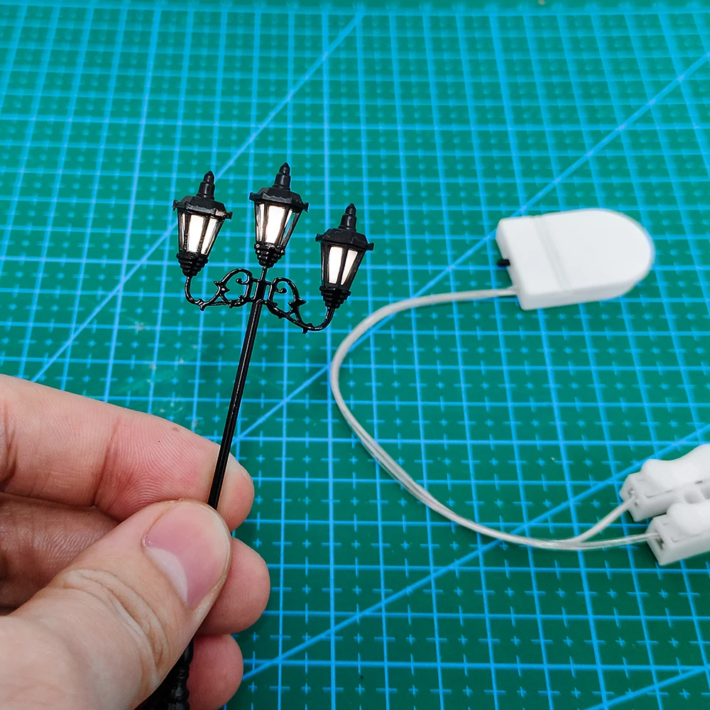 Bring a touch of vintage charm to your micro landscapes with this beautifully crafted miniature street lamp. Designed specifically for 1:87 scale models, such as railway layouts, city dioramas, and garden landscapes, it enhances realism and depth. The lamps are made from durable, high-quality plastic and feature a traditional three-head design with ornate support arms, offering an authentic look. Available in two color options—Warm White and Cool White—to suit various lighting atmospheres, these lamps emit realistic illumination. Easy to assemble and customizable with an optional battery box (not included), they are perfect for passionate hobbyists seeking to add a nostalgic, illuminated touch to their miniature scenes.
