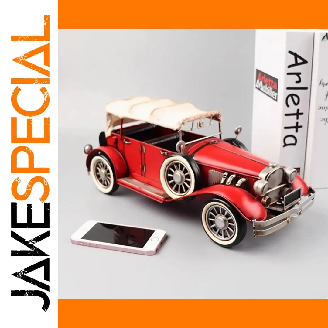Experience owning a piece of automotive history with this exquisitely crafted vintage-inspired diecast model car. Measuring approximately 40 centimeters in length, 14 centimeters in width, and 15 centimeters in height, this handcrafted ironwork piece captures the timeless elegance of an early 20th-century roadster. Its vibrant, glossy red body creates an eye-catching focal point, while the textured fabric soft top and detailed craftsmanship evoke authentic vintage charm. The silver-painted spoked wheels with black tires and whitewall accents add a nostalgic touch. Decorative elements like side mirrors, door handles, and a curved metal bumper complete the refined look. Perfect for collectors and enthusiasts, this model combines artistry and history into one striking display piece.
