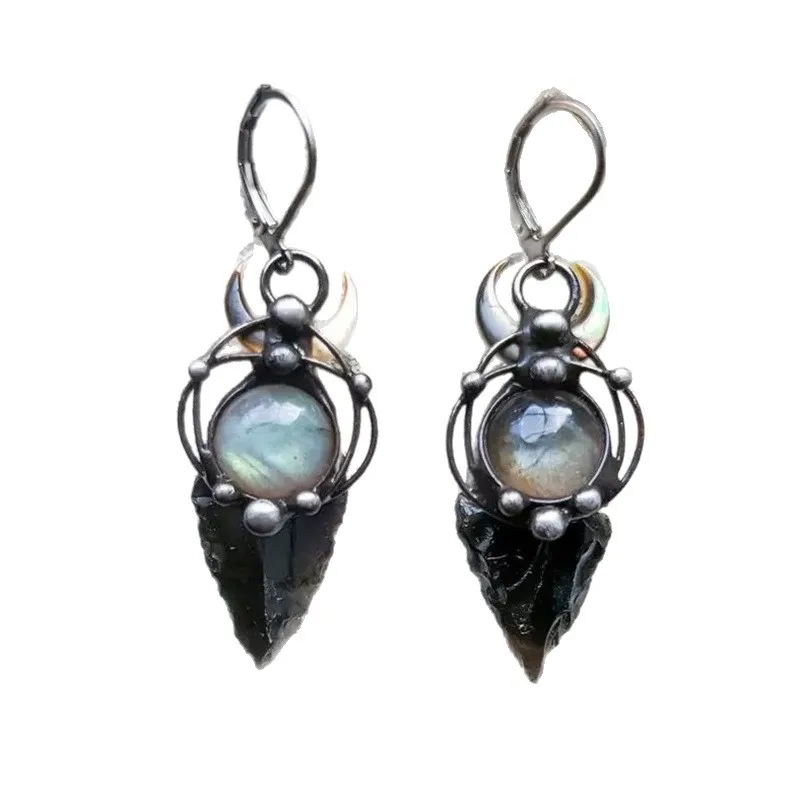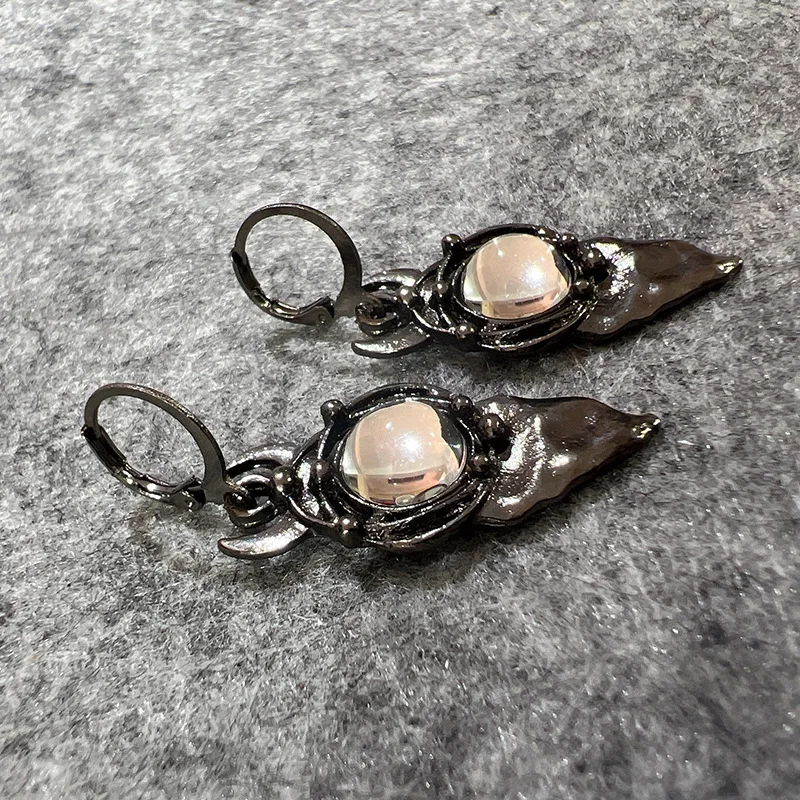 - The polished, gray-black moonstone-like inlay adds subtle color variation and a smooth surface, creating a mystical focal point at the center of each earring.