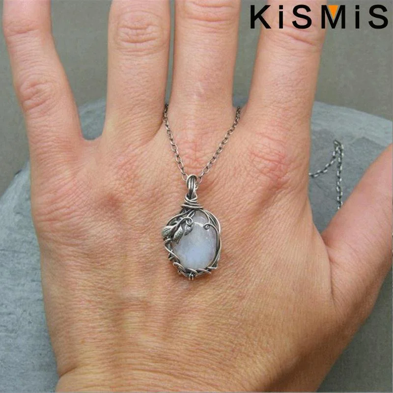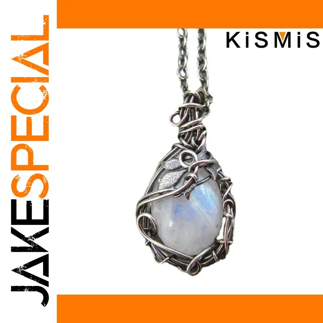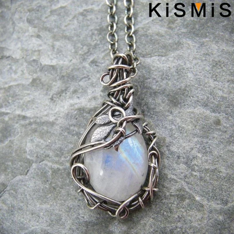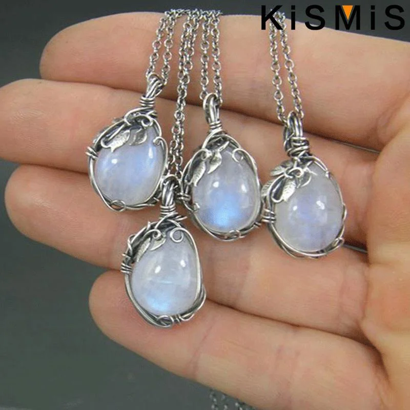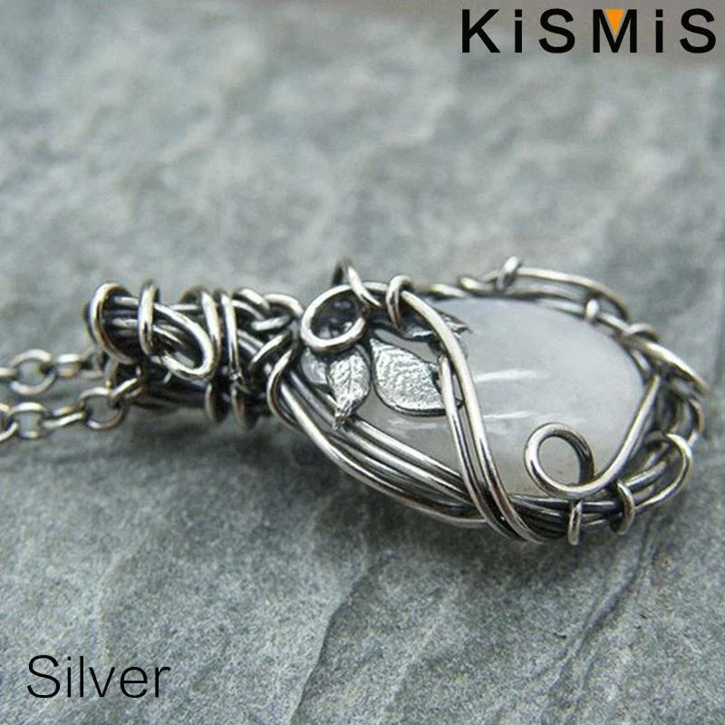 Enhance your style with this vintage-inspired winding moonstone necklace featuring a delicate silver aluminum alloy chain measuring 46+5cm with a water wave design. The teardrop-shaped alloy pendant is intricately wrapped with fine wire, securing a polished, artificial semi-precious gemstone that shimmers with iridescent hues of white, blue, and subtle rainbow flashes, reminiscent of moonstone’s enchanting glow. Designed in a European-American fashion, this unisex jewelry piece combines timeless elegance with artistic craftsmanship, accented by a small leaf detail near the top of the pendant. Perfect for any occasion, it’s a distinctive statement accessory that adds personality and charm to your ensemble.
