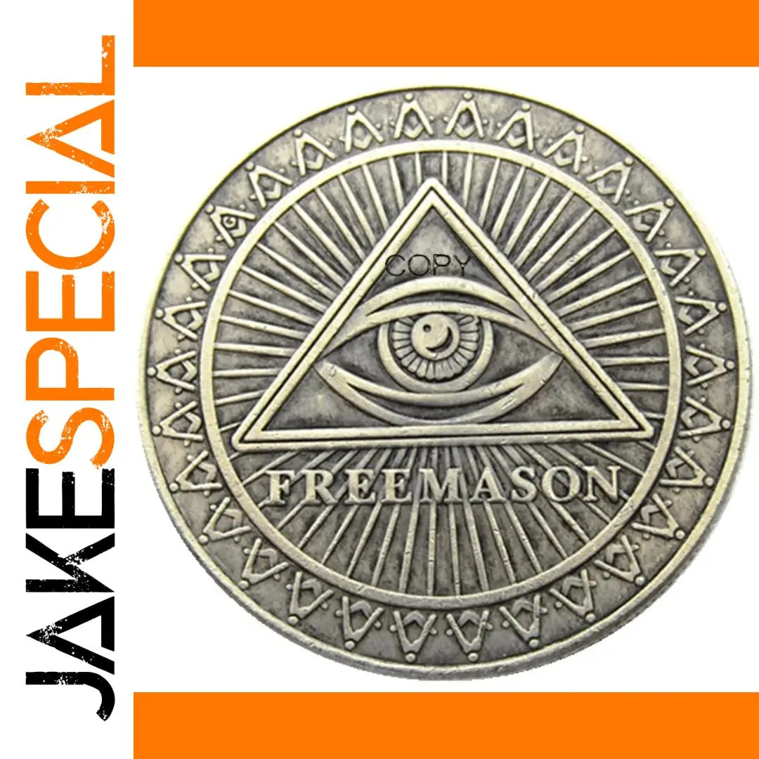 Imagine owning a piece of history with this meticulously crafted vintage Morgan coin replica. Its aged, distressed finish in silver or pewter evokes the nostalgia of late 19th-century American heritage. The intricate design features a prominent triangular symbol at the center, with a detailed eye and circular motif that radiate mystery and symbolism. Surrounding the central motif, radiating lines add depth, while the textured border of small, evenly spaced triangular shapes and connecting dots creates an ornate, antique finish. Beneath the triangle, the word “FREEMASON” enhances its patriotic and historical theme. This coin is perfect for vintage décor, collector displays, or patriotic memorabilia, reflecting craftsmanship and timeless style in every detail.
