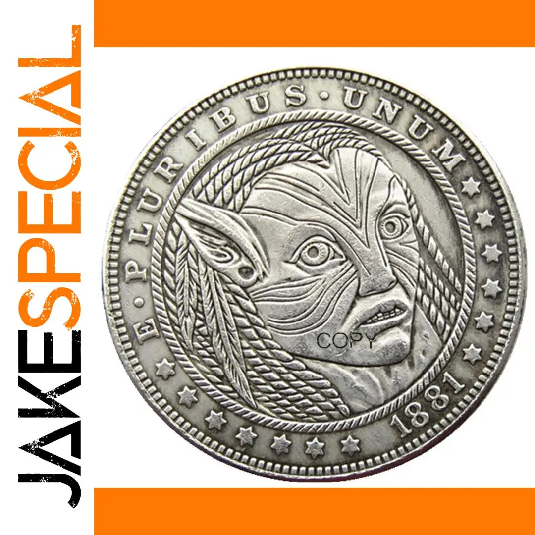 Discover this striking replica coin that combines vintage US style with a fantasy twist. Featuring a detailed relief design, it showcases a humanoid face with elf-like pointed ears, prominent cheekbones, and a slightly open mouth, embodying a mythical aesthetic. Ornate flowing lines form the hair or headdress, symbolizing tribal or mythical themes. The border is decorated with a row of evenly spaced stars separated by small dots, adding a classic ornamental touch. The inscription “E PLURIBUS UNUM” crowns the top, with the year “1881” engraved at the bottom, further emphasizing its historical inspiration. Its aged, tarnished silver finish enhances the nostalgic, antique look, making it perfect for collectors and enthusiasts of vintage-themed memorabilia or patriotic art.