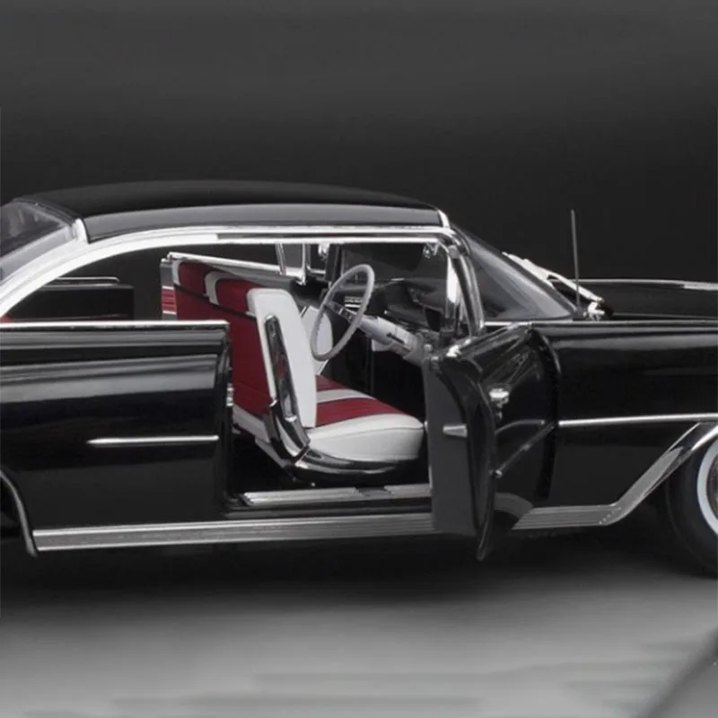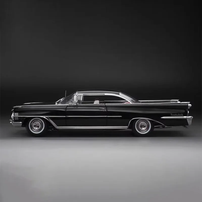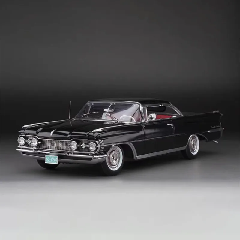 Imagine adding this exquisite vintage Oldsmobile model to your collection, bringing timeless elegance and nostalgic charm to your display. Carefully crafted in a 1:18 scale, this platinum edition replica measures 29.5 centimeters in length, 10.5 centimeters in width, and 9.5 centimeters in height. Its alloy body boasts a glossy black finish with a shiny metallic sheen, capturing the sleek curves and classic design elements of mid-20th-century automotive artistry. The detailed front grille, four circular headlights, chrome accents, and realistic hubcaps elevate its authentic appearance. The transparent windows reveal a striking red interior with visible steering wheel and dashboard components. This model embodies vintage sophistication, perfect for display and collection enthusiasts.