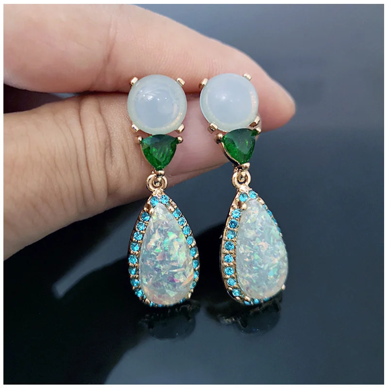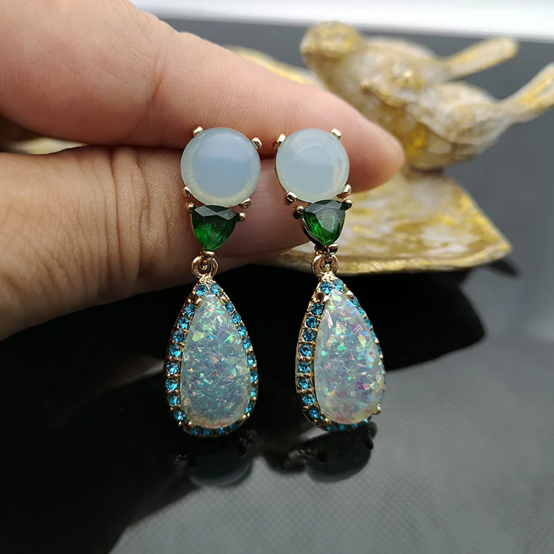 Step into timeless elegance with these vintage-inspired drop earrings, perfect for enhancing your special occasion look. Crafted from zinc alloy with a luxurious gold-tone finish, these earrings feature a stunning teardrop shape with an iridescent, opal-like surface that shifts with vibrant, colorful hues. The top boasts a smooth, glossy round moonstone accent in a soft light blue, adding a refined touch, while a delicate heart-shaped element below introduces a charming detail. The intricate design is further accentuated with tiny shimmering stones set in a gold framework, creating a luminous sparkle that complements the overall vintage aesthetic. Lightweight and fashionable, these earrings are ideal for parties, weddings, or engagements, making you feel sophisticated and radiant.