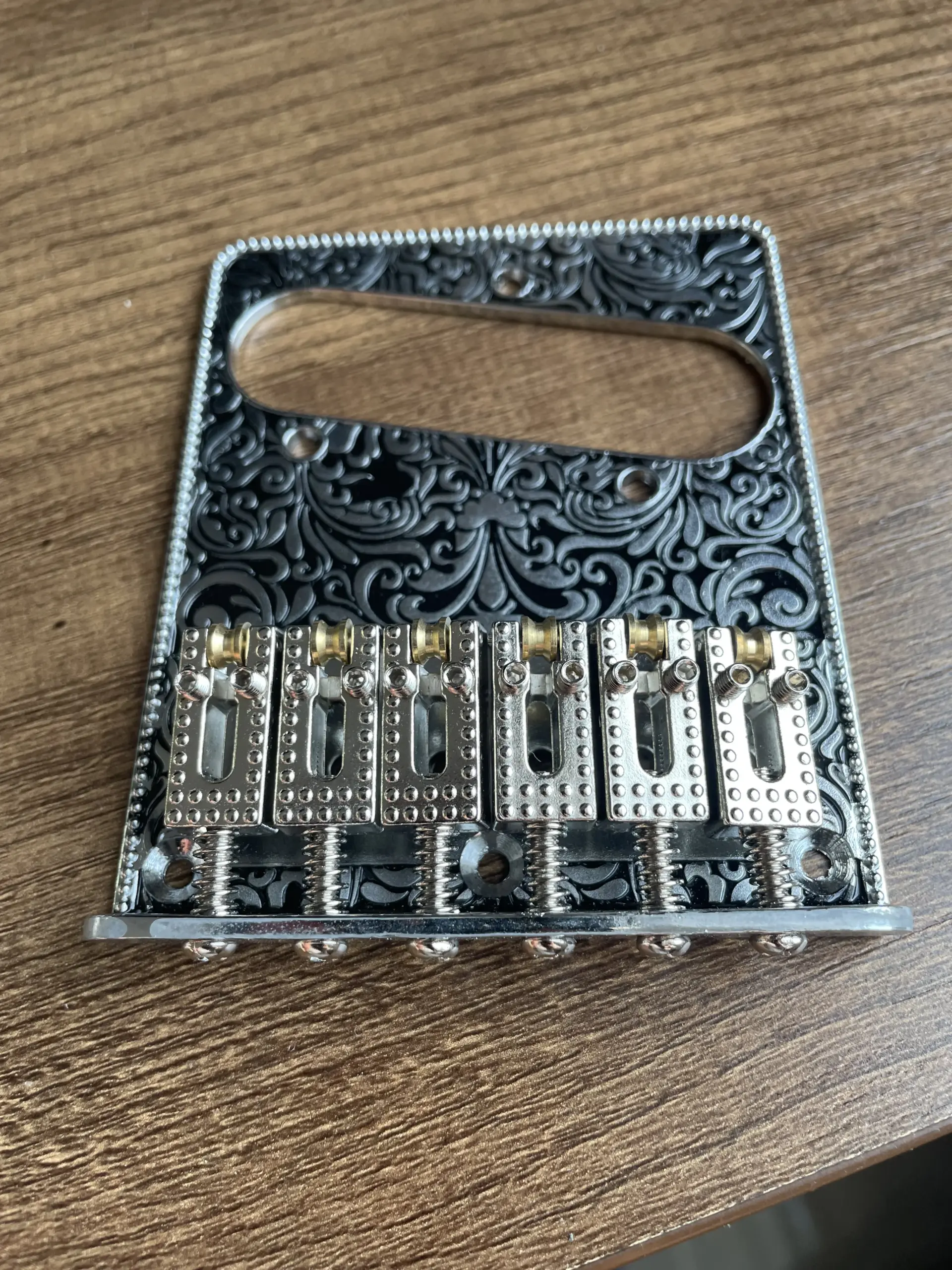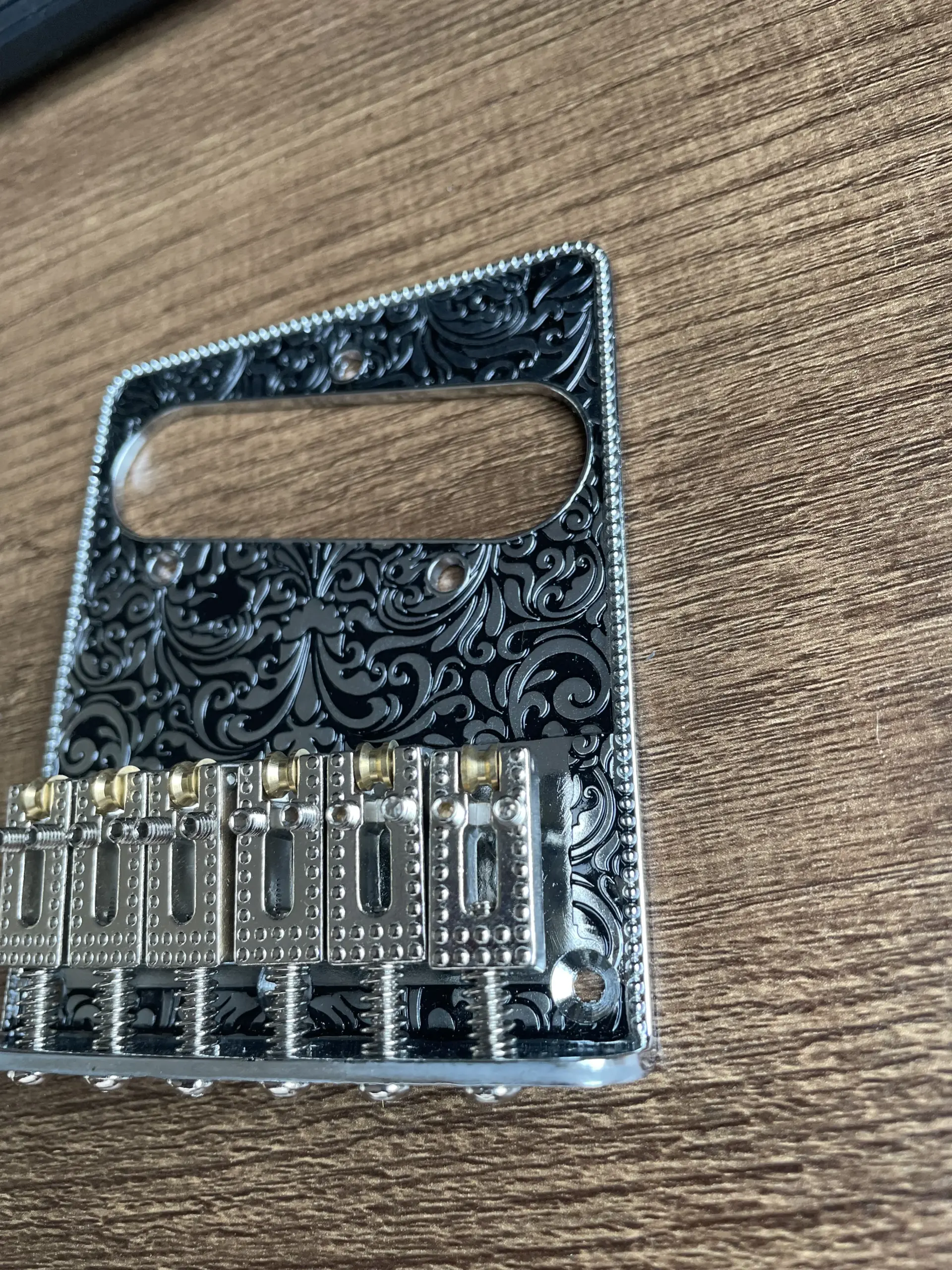 Elevate your electric guitar with this customized alloy bridge, featuring a beautifully carved black metal plate adorned with intricate swirling and floral patterns for a vintage-inspired aesthetic. It includes six silver-colored iron saddles, each with rounded edges and small circular indentations for textured detail, and gold-colored adjustment screws for precise tuning. Crafted from durable alloy and iron, this solidly built bridge offers both functionality and artistic flair, suitable for DIY installation on TL or similar models. Its combination of ornate design and high-quality materials makes it the ideal upgrade for guitar enthusiasts seeking a striking, vintage look with reliable performance.