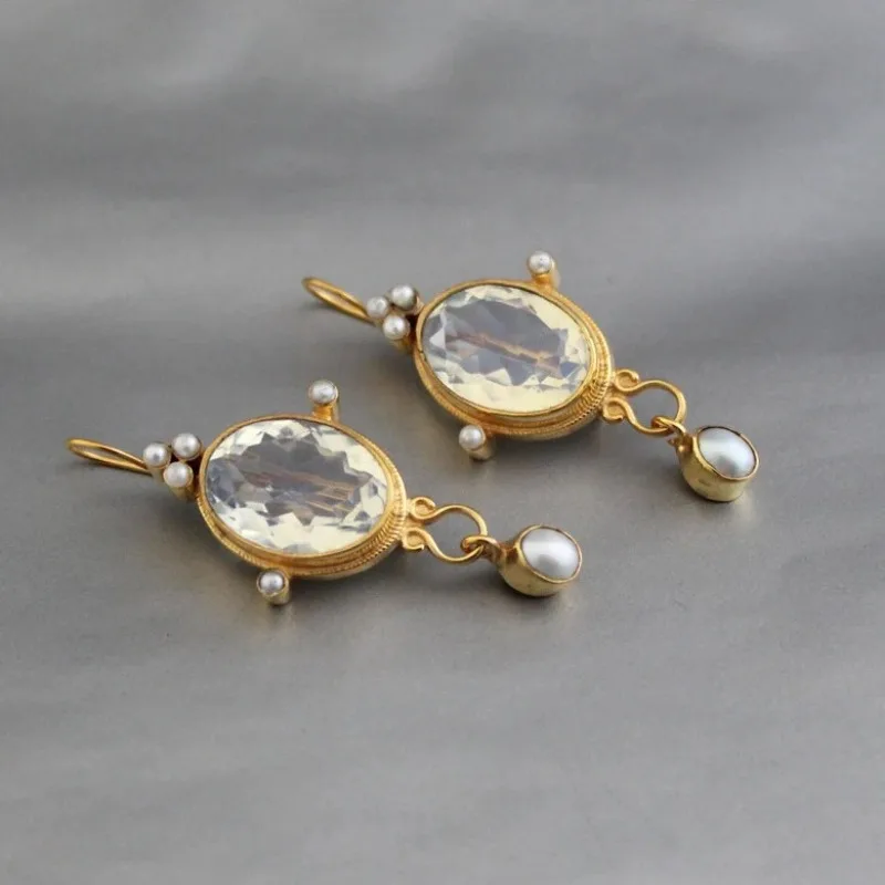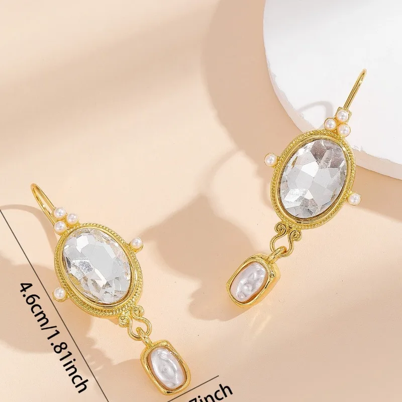 Transform your look with these stunning vintage oval earrings, perfect for adding a touch of elegance to any outfit. Designed with a classic geometric shape, each earring features a textured gold or silver-colored zinc alloy frame accented by white stones that reflect light beautifully. The large, faceted transparent crystals at the center create a dazzling, jewel-like shimmer, making these earrings ideal for special occasions or daily sophistication. Dangling just below the oval is a delicate imitation pearl, enhancing the luxurious vintage aesthetic. Whether you're attending a wedding, party, or simply want to elevate your everyday style, these earrings promise a refined, timeless appeal that complements your individuality and elegance.