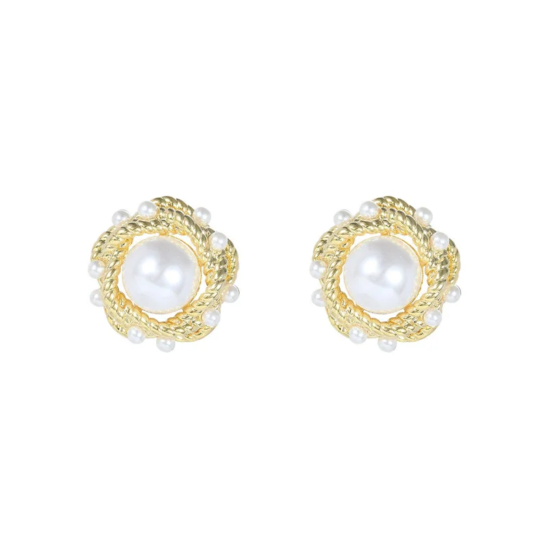 Enhance your style with these vintage-inspired women’s stud earrings featuring a classic round design. Crafted from zinc alloy with a shiny gold-colored finish, they are adorned with large, smooth imitation pearl beads and smaller pearls along the edges, creating an elegant and ornate look. The earrings measure approximately [size], secured with a push-back clasp for a comfortable and secure fit—perfect for adding a touch of bohemian sophistication to any outfit. Made in Zhejiang, these jewelry pieces are crafted with care, free from concerning chemicals, ensuring quality and safety for everyday wear.