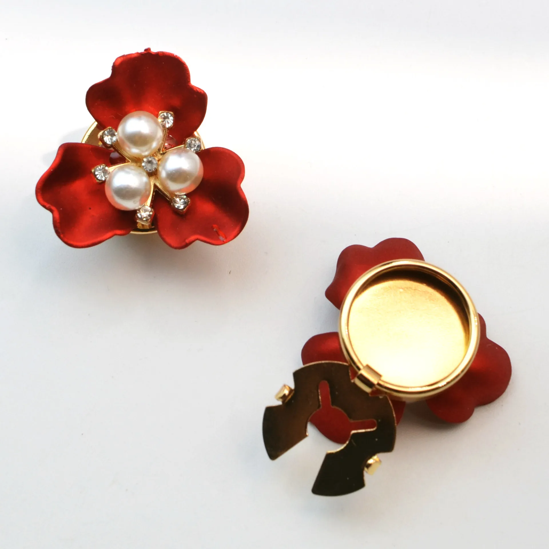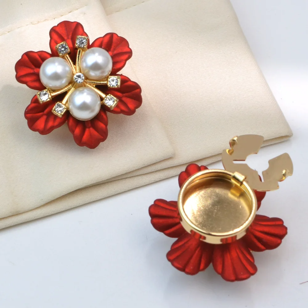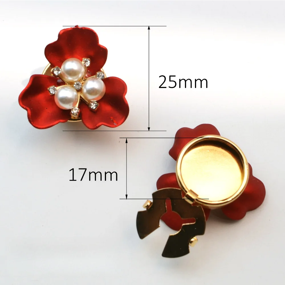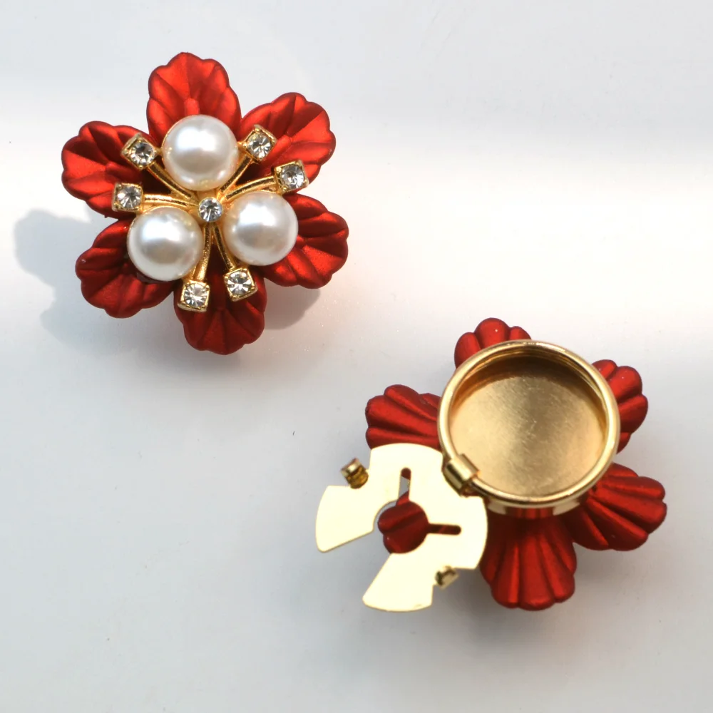 The vintage pearl flower button covers are a stunning addition to any accessory collection, featuring a beautiful three-petal flower design. Each crafted from soft, satin-like alloy material offers a nostalgic touch. Consisting of two vibrant red covers and one shimmering white, these pieces are adorned with clusters of white pearls at their centers, enhanced by sparkling gemstones for added brilliance. The retro aesthetic urbanizes effortlessly across both genders. Perfect for jackets, backpacks, hats, or any DIY clothing projects, these versatile covers bring uniqueness and charm to your style.