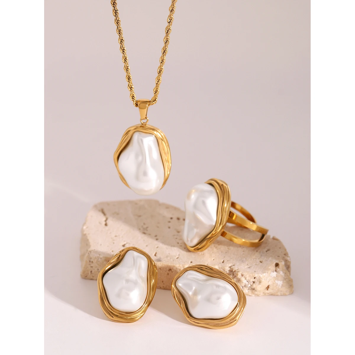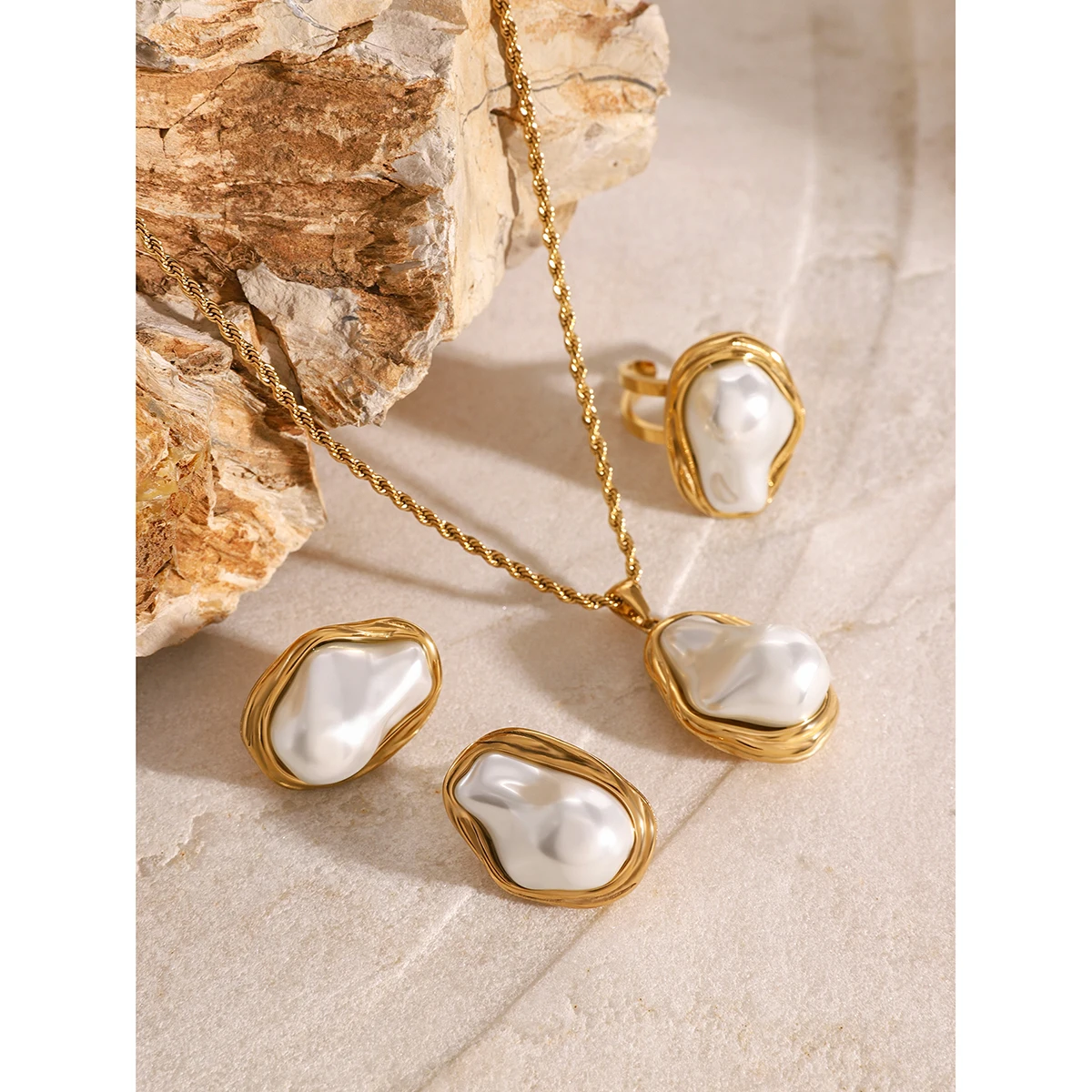 Elevate your elegance with this vintage-inspired 3-piece jewelry set featuring large, lustrous baroque pearls encased in a durable, PVD gold-coated stainless steel design. Each piece—whether a ring, necklace, earrings, or bracelet—is crafted for longevity, resisting fading, scratches, and water with a nickel, lead, and cadmium-free finish. The set’s sophisticated round shapes and organic pearl motifs make it perfect for galas, engagements, or stylish occasions, adding a touch of timeless charm. Weighing approximately 15 grams, this versatile collection combines luxury with practicality, ensuring you sparkle effortlessly for years to come.