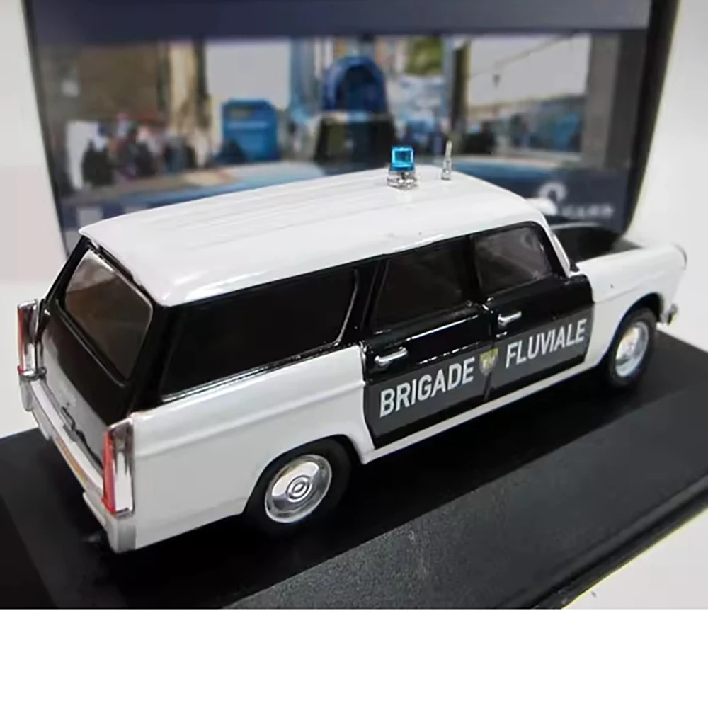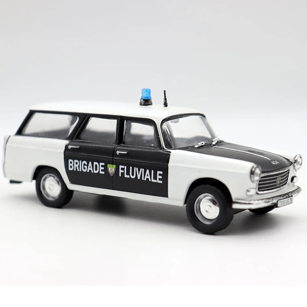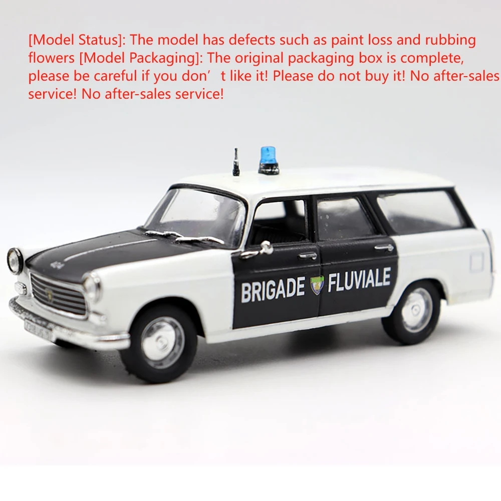 This detailed 1:43 scale die-cast model depicts a vintage PEUGE 404 BREAK Police Car, crafted from alloy, plastic, and rubber. Featuring a classic white body with a striking black door section and “BRIGADE FLUVIALE” signage, the model showcases authentic design elements such as a horizontal slat grille, round headlights, a silver front bumper, and a roof-mounted blue siren with a black antenna. The transparent windows with black frames, silver windshield wipers, and realistic silver hubcaps on black rubber tires add to its vintage charm. Intended for collection and display, it exhibits minor paint flaws like paint loss and rubbing marks, with original packaging included.