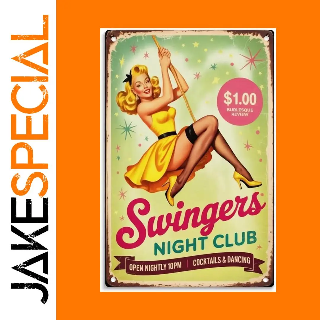 Bring a retro charm to your space with this vintage pin-up girl swingers night club metal sign. Measuring available sizes of 20cm x 14cm, 20cm x 30cm, or 30cm x 40cm, it’s crafted from durable tinplate. The sign showcases a cheerful pin-up girl with classic mid-20th-century style: blonde curls with a black bow, a vibrant yellow strapless dress, black thigh-high stockings with a garter, and cheerful high heels. The background features a lively light green gradient with colorful starburst and star shapes, all finished with a slightly distressed vintage look. Perfect for indoor or outdoor display, this sign will add a playful, nostalgic vibe to any bar, cafe, bedroom, or garage. It’s a wonderful gift for vintage enthusiasts.