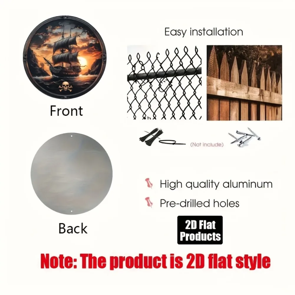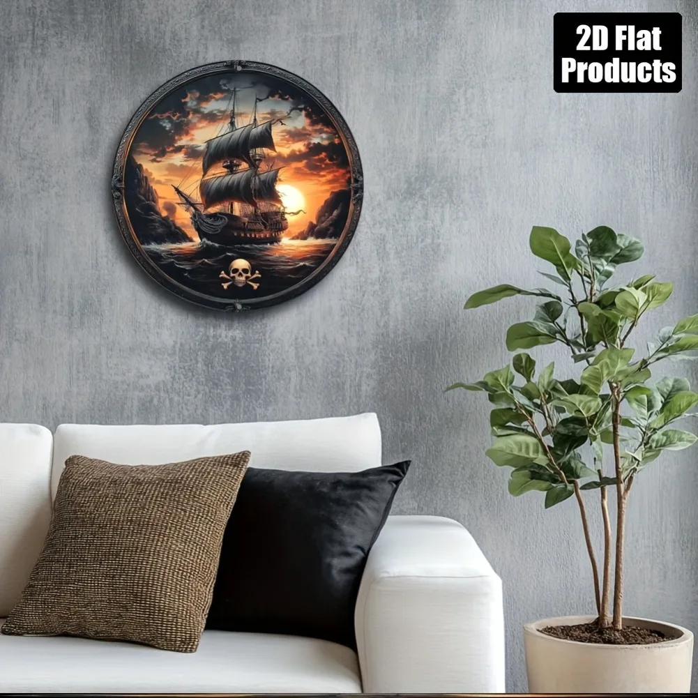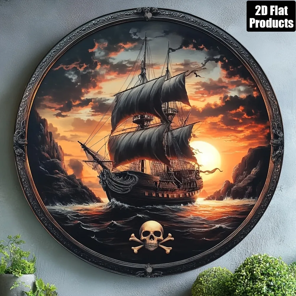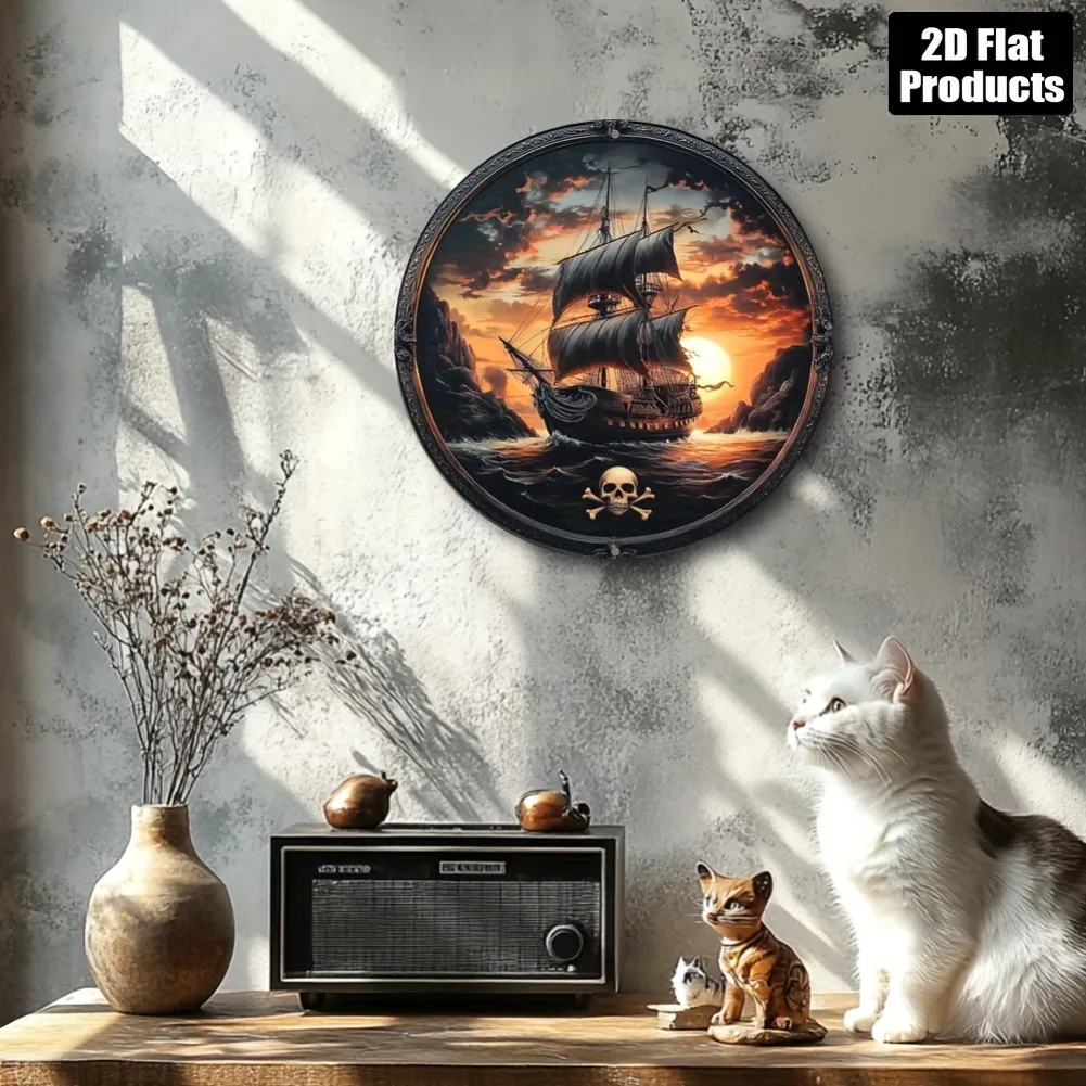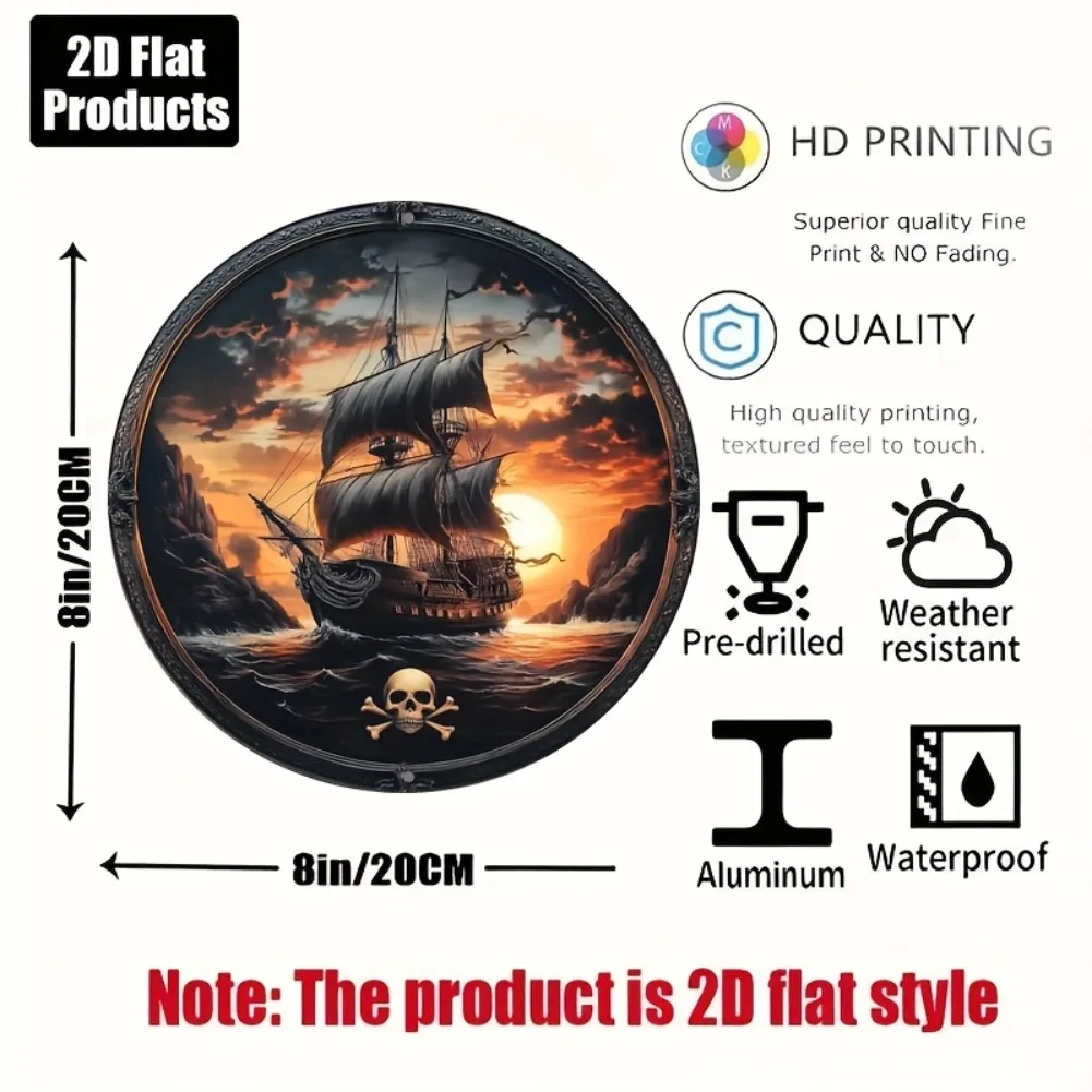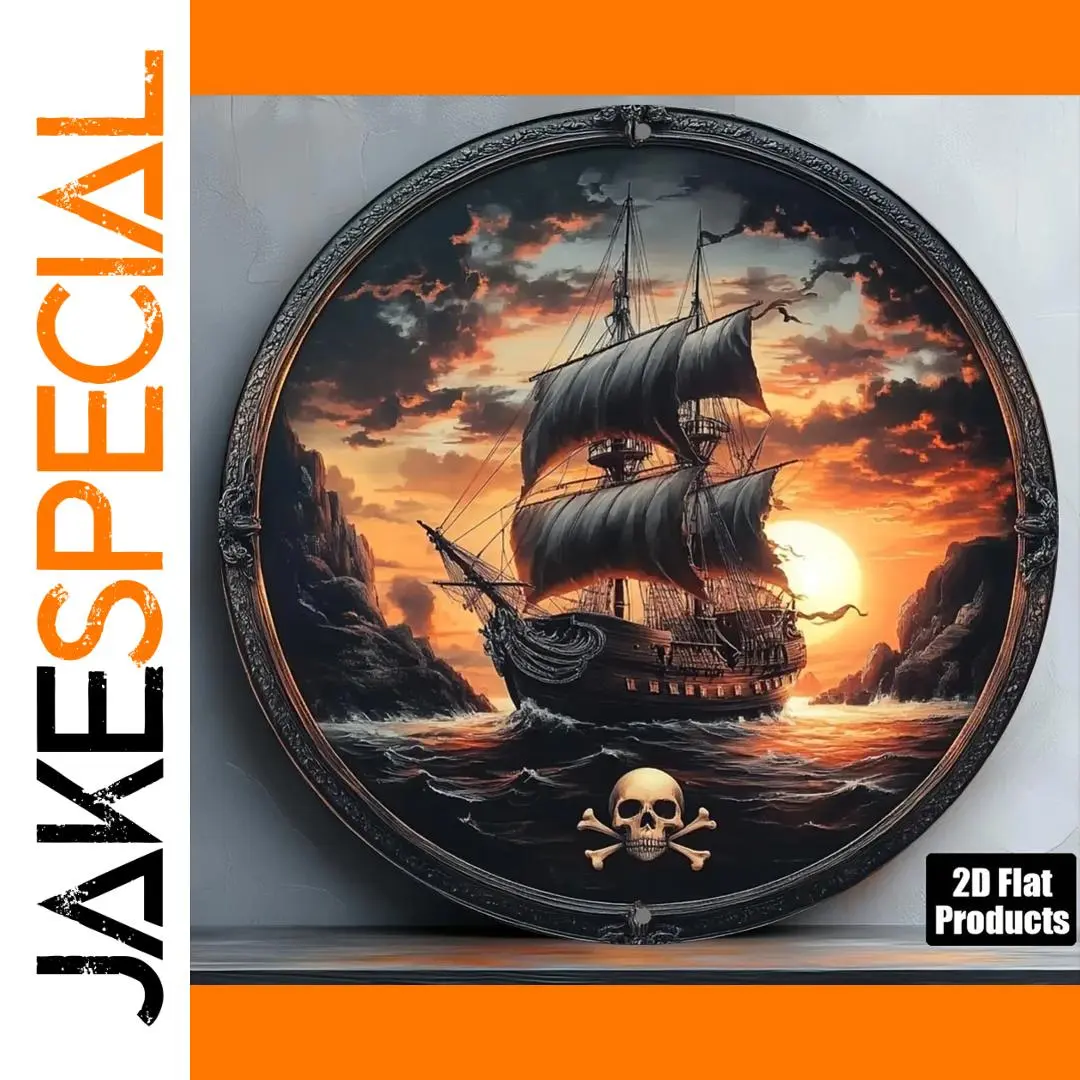 Imagine adding a striking nautical touch to your space with this vintage-style pirate ship wall art. Crafted from durable aluminum, this round decorative plaque features an intricate depiction of a majestic pirate ship sailing across turbulent waters at sunset. The scene is vibrantly contrasted with shadows and luminous sky hues of orange, yellow, and pink, set against dramatic storm clouds. An ornate, vintage-inspired circular frame enhances its antique charm, while a bold skull and crossbones add character and theme authenticity. Available in two sizes—20x20cm or 30x30cm—it’s designed as a versatile decorative piece that can be mounted easily or displayed freely. Perfect for emphasizing a maritime or pirate aesthetic in your favorite space.