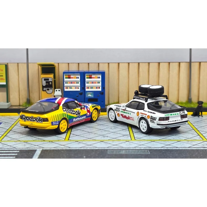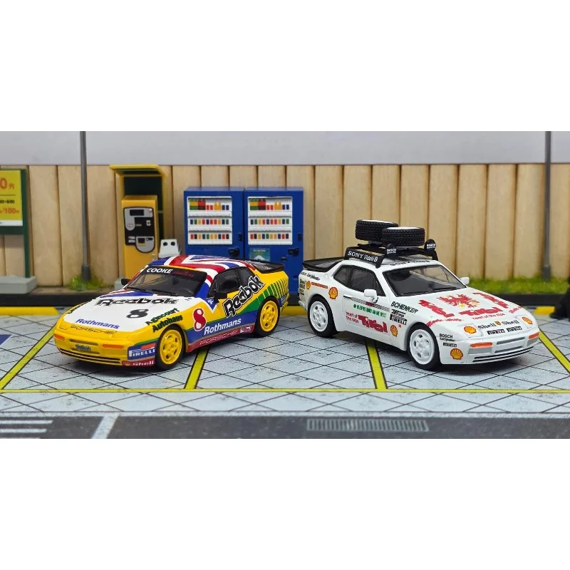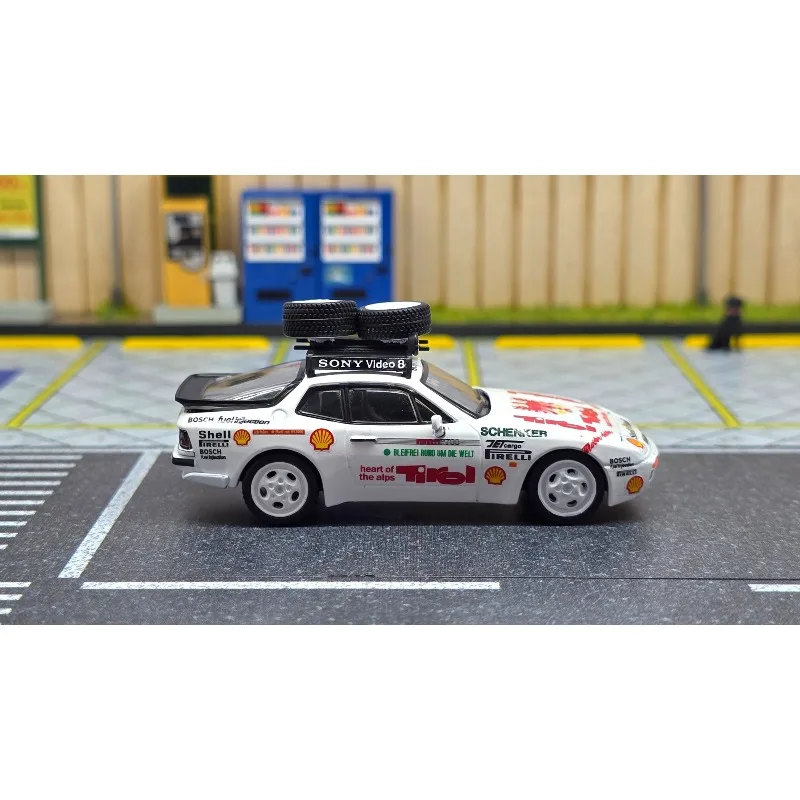 - Features roof-mounted spare tires on the white Porsche 944 Turbo, enhancing realism and race-inspired aesthetic that collectors cherish.