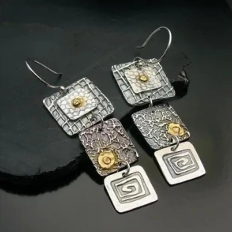 Elevate your style with these vintage-inspired women’s dangle earrings, crafted from zinc alloy. Featuring a bold square design measuring approximately 1-2 cm, each earring showcases a textured, punk geometric carved pattern with raised grid-like details. Accented by small gold-colored circular and spiral embellishments, the earrings combine industrial aesthetics with a vintage charm. Designed with long hooks for comfortable wear, they are perfect for parties, weddings, and engagements. This pair offers a striking contrast of silver-tone metal and gold accents, making them a versatile accessory for those who appreciate edgy, geometric fashion.
