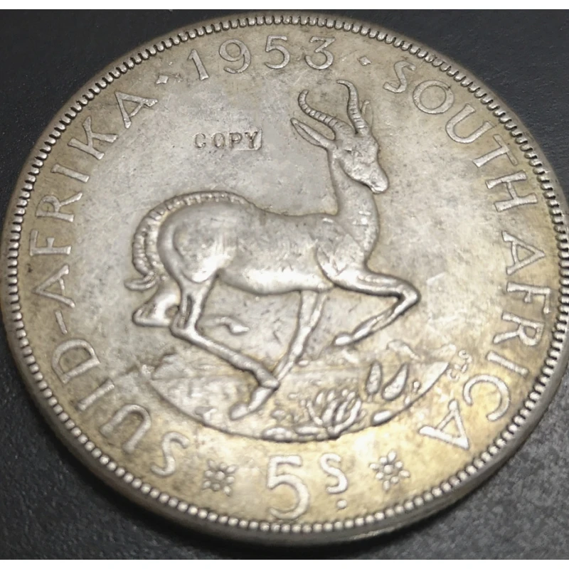 This detailed cast coin replica from South Africa, dated between 1940 and 1959, features the first portrait of Queen Elizabeth II facing right. Crafted with a vintage antique style, it showcases her wavy hairstyle, laurel wreath crown, and finely engraved facial contours. The coin’s surface has a slightly worn patina, complementing its historical appearance. Encircling the profile is the inscription “ELIZABETH II REGINA” in bold, capitalized letters, and the reeded edge adds texture. Made from metal imitation using casting techniques, this coin captures the classic elegance of mid-20th century African currency, perfect for collectors and display enthusiasts.