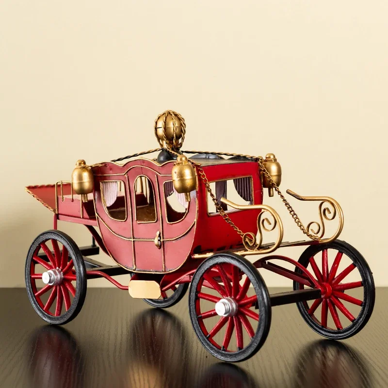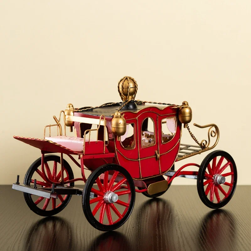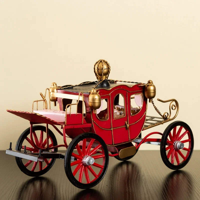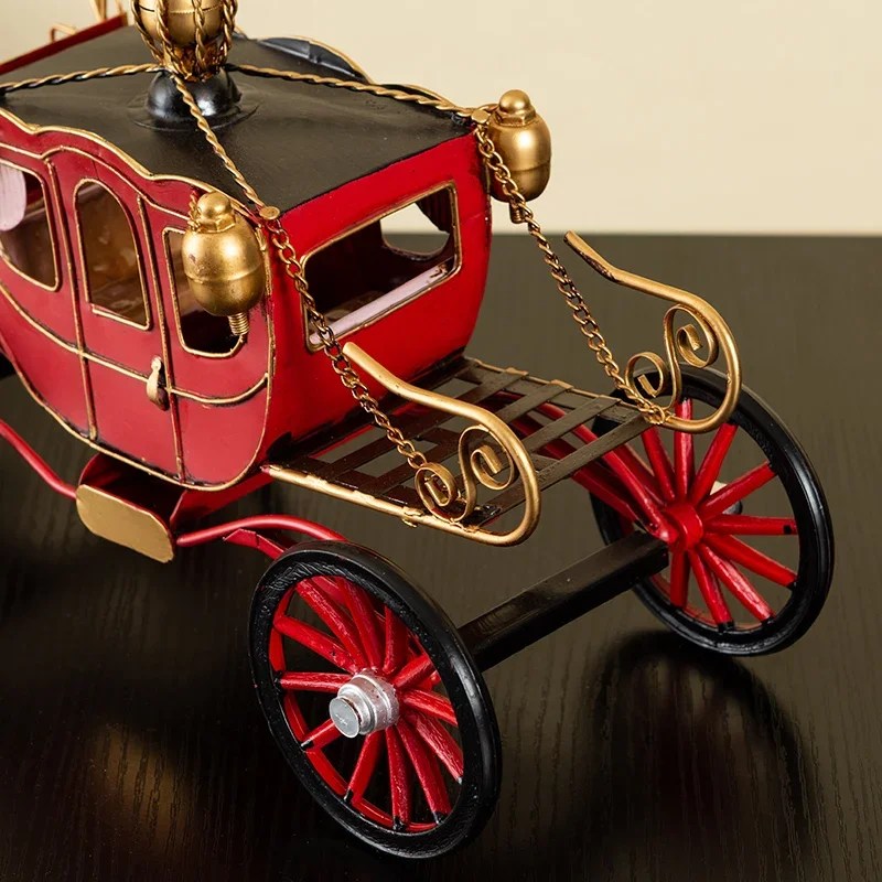Experience the charm of this vintage-inspired metal carriage ornament, designed to bring an elegant, nostalgic touch to your home decor. Measuring approximately 35cm in length, 15cm in width, and 21cm in height, it weighs around 0.9kg for a solid feel. Crafted from high-quality metal, this piece showcases a wrought iron style with meticulous detailing, including smooth, clean surfaces and ornate gold accents. Its vibrant red finish highlights the classic vintage design, while the curved roof, rounded windows, and finial add to its old-fashioned appeal. With its realistic spoked wheels and intricate craftsmanship, this ornament is perfect for decorating mantels, shelves, or craft projects that evoke a sense of retro elegance and timeless craftsmanship.