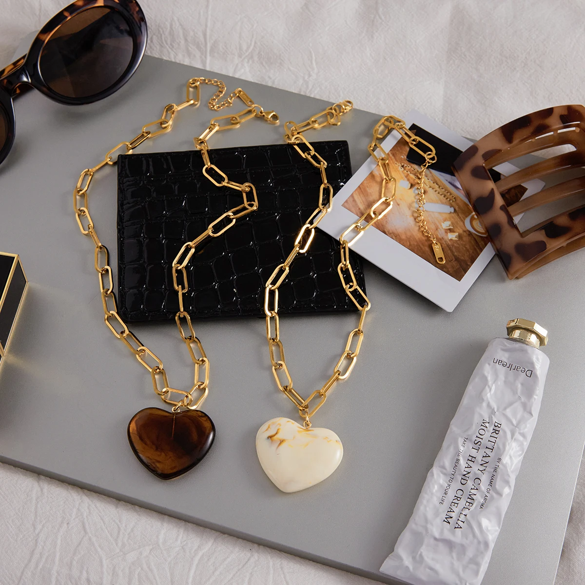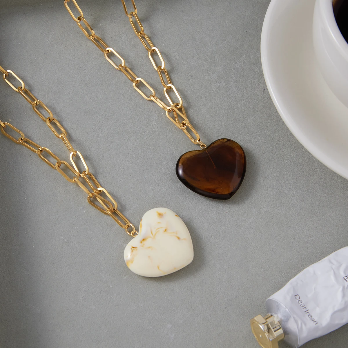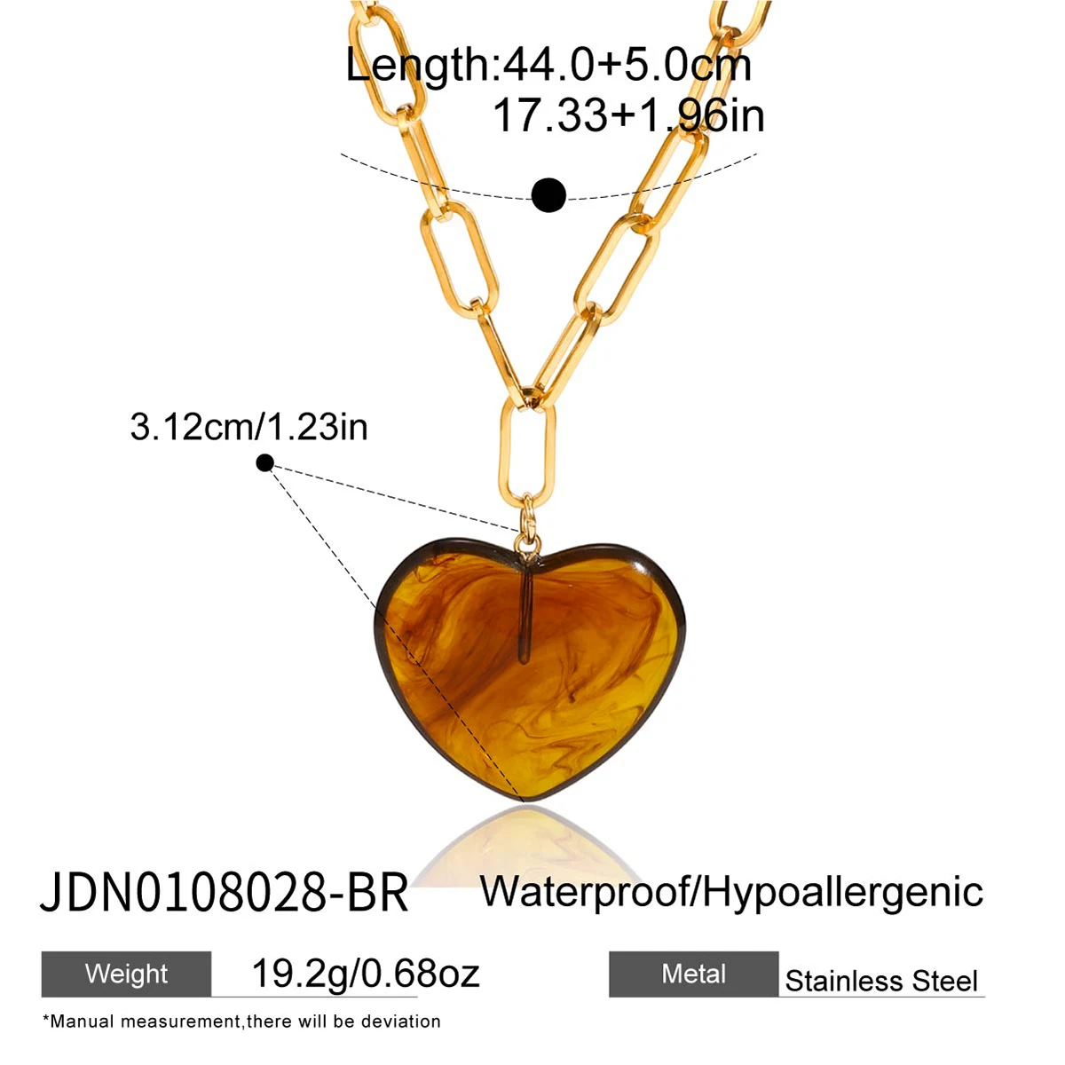 Experience the perfect blend of vintage charm and contemporary style with this elegant necklace. Designed to elevate your everyday look or add a sophisticated touch to special occasions, this piece features a sleek stainless steel chain approximately 45 cm long with elongated rectangular links that exude an industrial-modern vibe. The heart-shaped resin pendants come in two captivating colors: a warm, swirling dark amber (model code: JDN0108028-BR) and a delicate ivory with subtle light veining (model code: JDN0108028-WT). Each pendant boasts a glossy, smooth surface with intricate marbled or veined patterns, adding depth and visual interest. This versatile necklace perfectly balances durability, comfort, and style, making it a timeless addition to your jewelry collection.