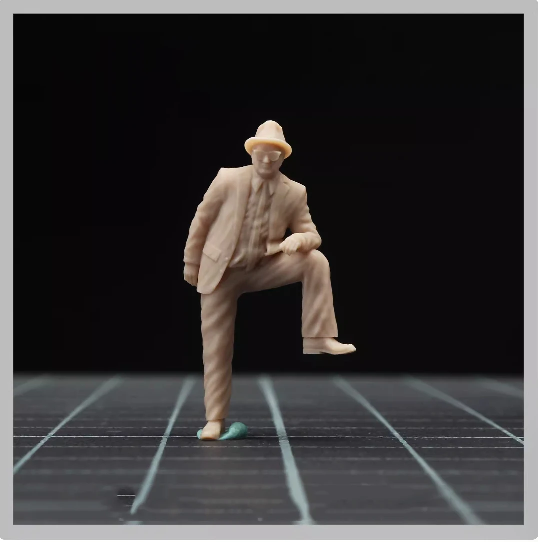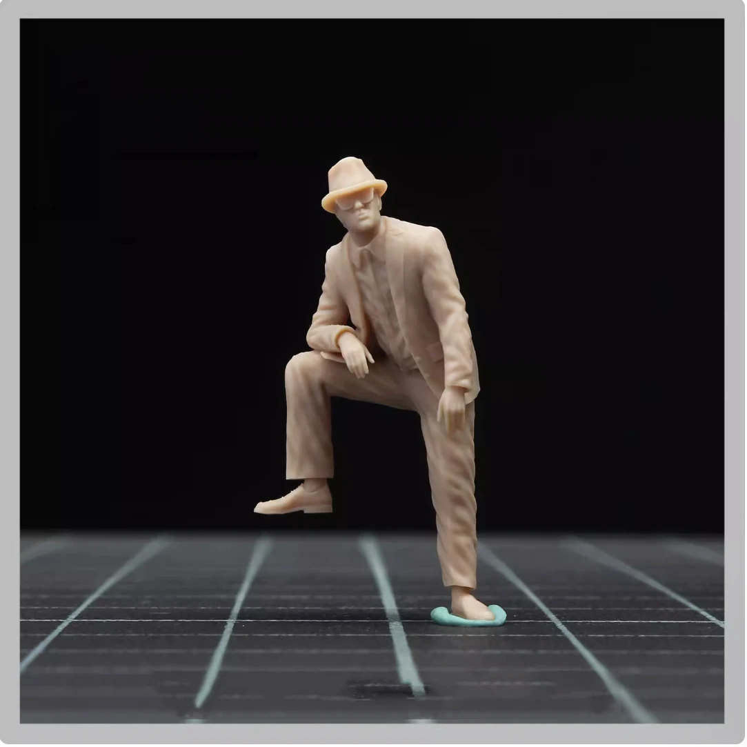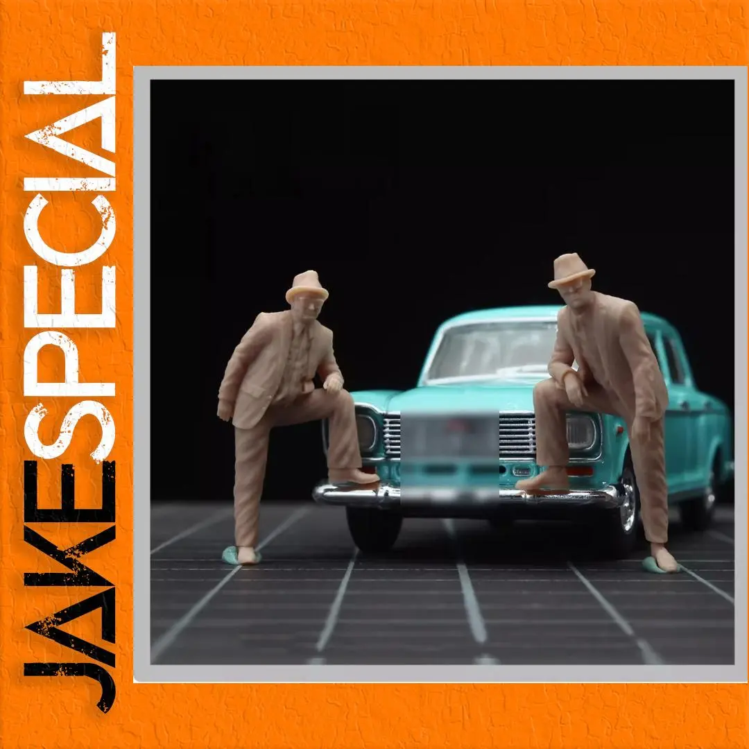 This exquisite resin model features two miniature figures elegantly dressed in identical light brown suits and stylish hats, set against the backdrop of a vibrant turquoise vintage car. The figures showcase intricate details, including expressive facial features and realistic folds in their clothing. One figure stands with a foot raised on the car, while the other leans casually, exuding charm and playfulness. Available in scales 1/64 (2.7 cm height) and 1/43 (4.0 cm height), this model is perfect for DIY projects, car decorations, and creative photography, allowing you to visualize scenic moments in exquisite detail.