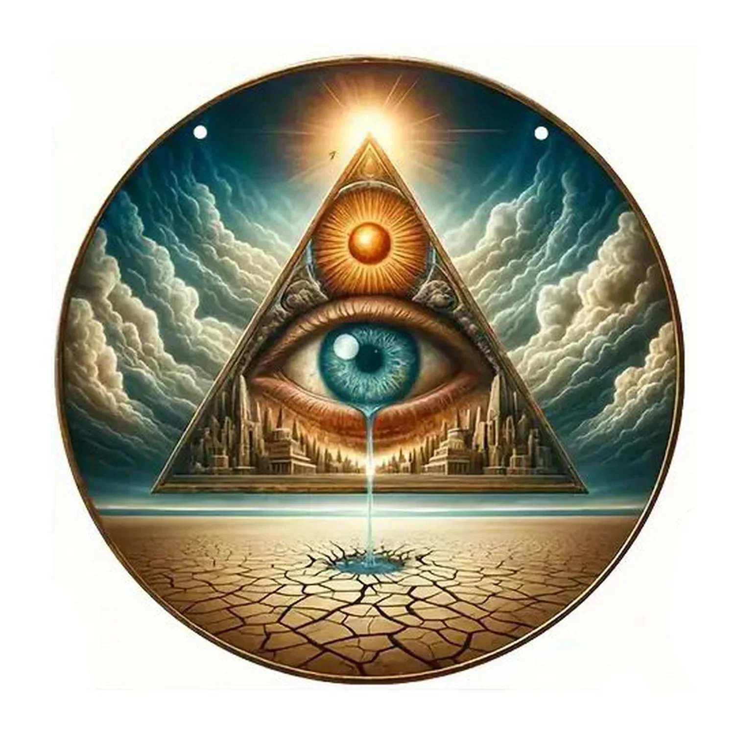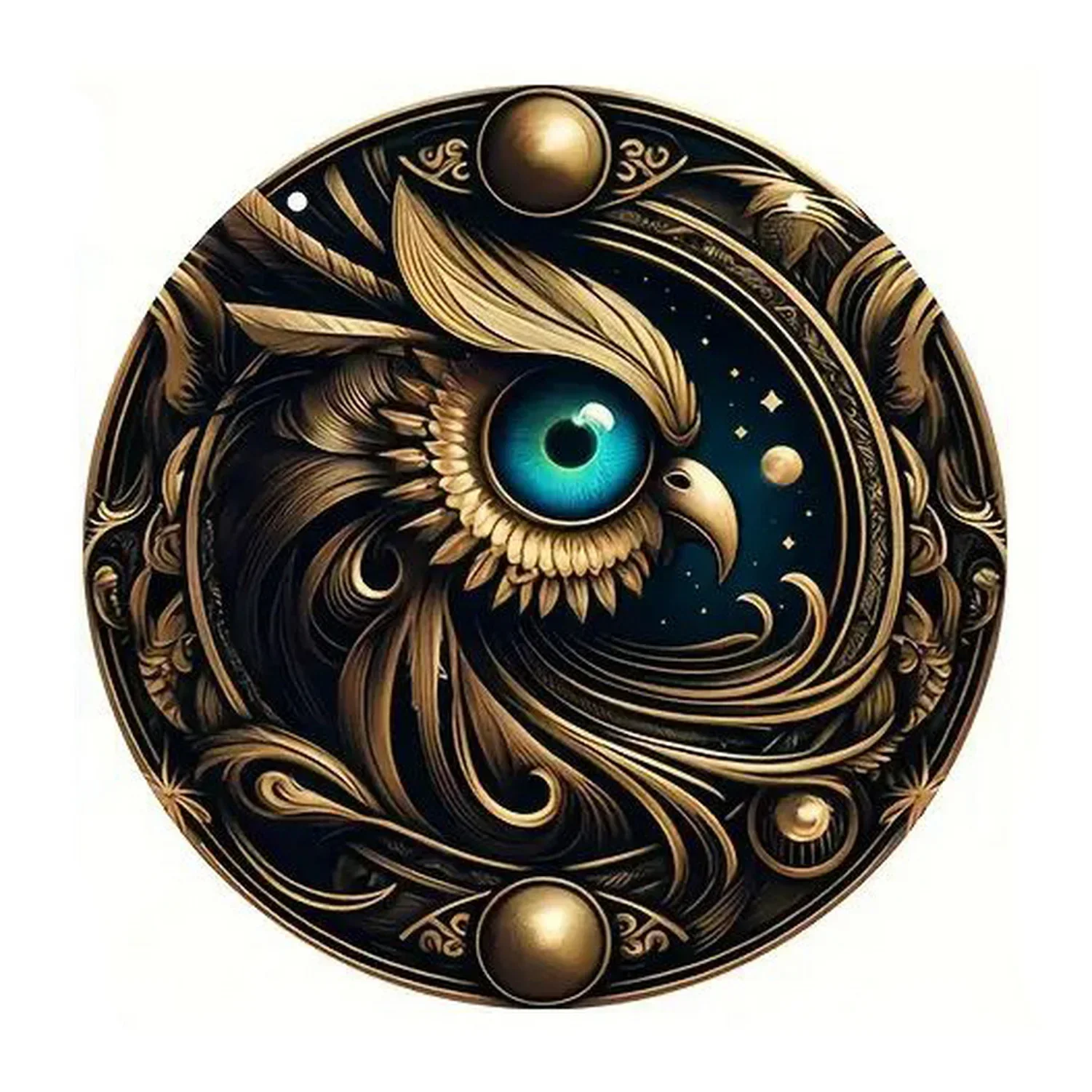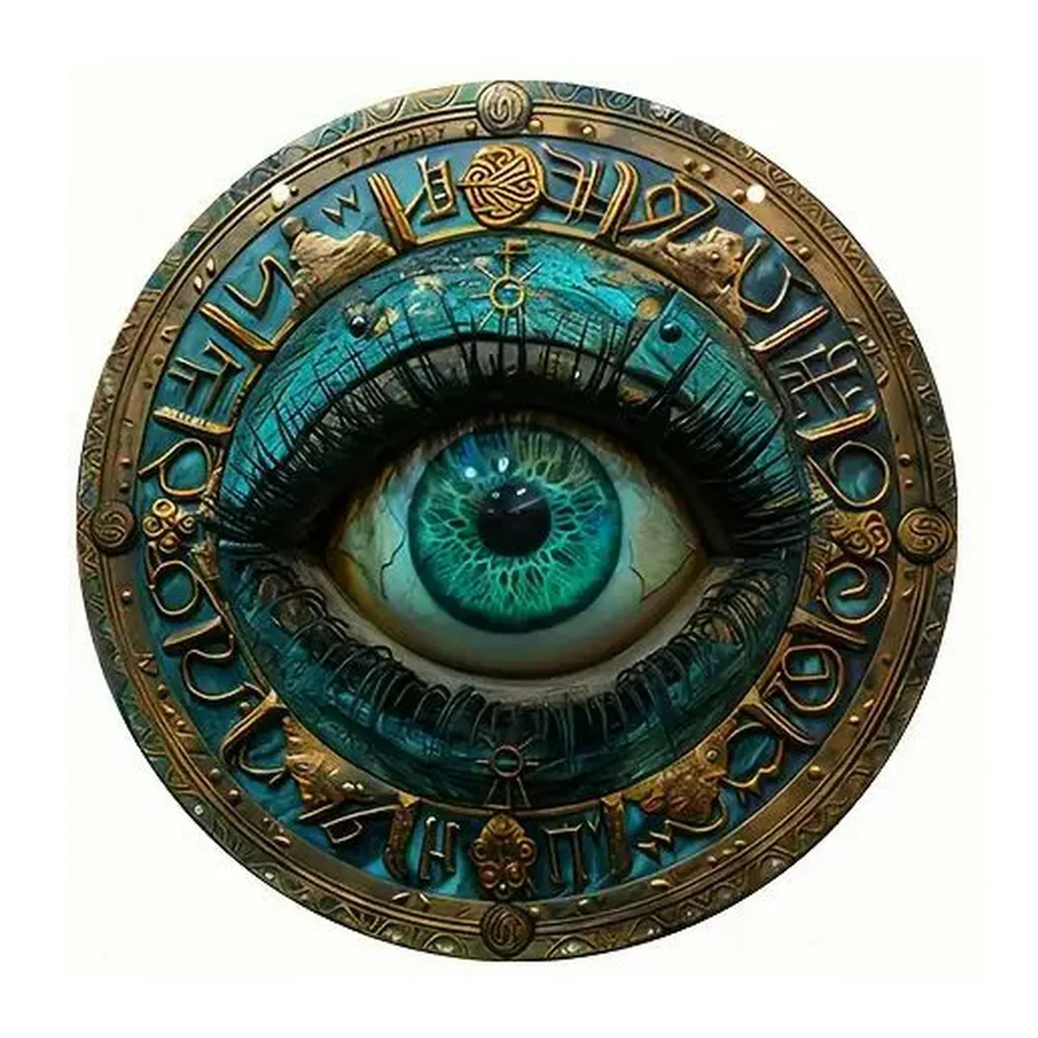 Imagine adding a touch of vintage charm to your space with this beautifully crafted retro round metal tin sign. Available in two sizes—20cm x 20cm aluminum and 30cm x 30cm iron—this sign features a timeless design with a vintage finish that effortlessly blends nostalgia with style. Its intricate, mystical artwork showcases eye motifs, celestial themes, and geometric patterns rendered in shades of blue, gold, brown, and vibrant colors. Pre-drilled holes make mounting easy, whether inside your bar, cafe, garage, or home. Lightweight and durable, this decorative piece transforms ordinary walls into captivating focal points. Imagine it hanging proudly on your wall, sparking conversations and admiration from guests and visitors. This sign is perfect for adding personality and a unique vibe to your favorite spaces.