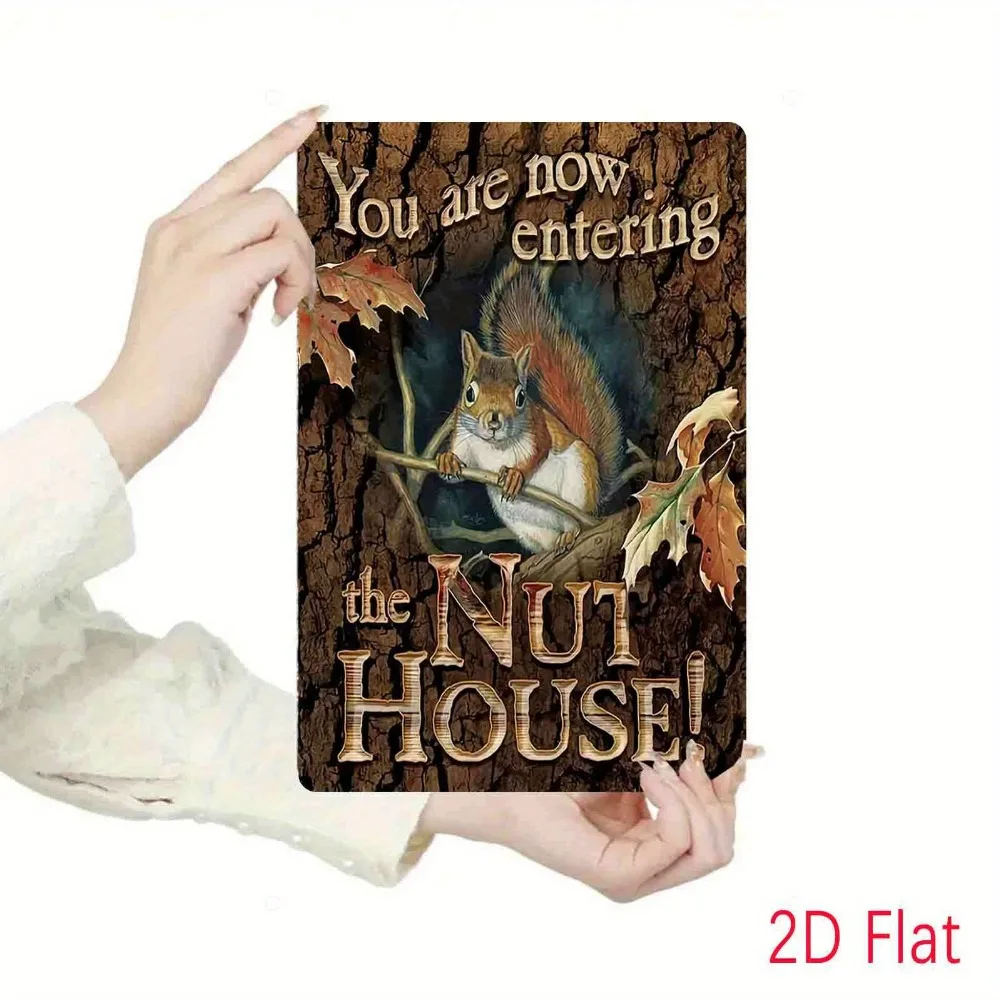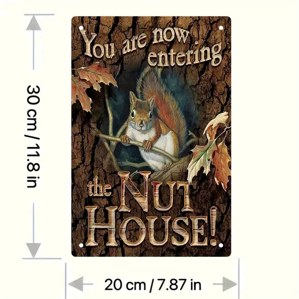Imagine enhancing your space with this beautifully crafted vintage-style aluminum wall sign, measuring 20cm x 30cm (8×12″). Its textured, bark-like background in warm brown tones, accented with earthy greens and reddish hues, creates an inviting woodland scene. Featuring a detailed squirrel perched on a branch surrounded by hazelnuts and lush leaves, the sign exudes natural, outdoorsy appeal. The playful, curved lettering at the top reads “You are now entering,” while bold, wood-textured fonts at the bottom display “the NUT HOUSE!” This lightweight yet durable piece offers a perfect blend of rustic charm and craftsmanship, making it an ideal adornment in various settings—from cafes and bars to outdoor gardens and garages. Its vintage finish adds nostalgic warmth to any wall.