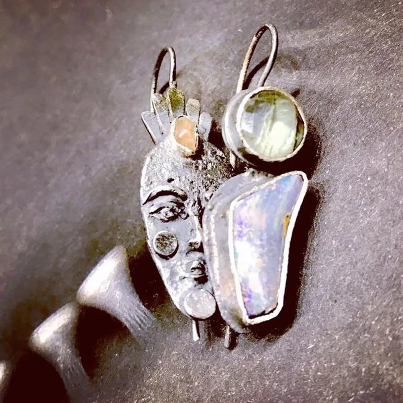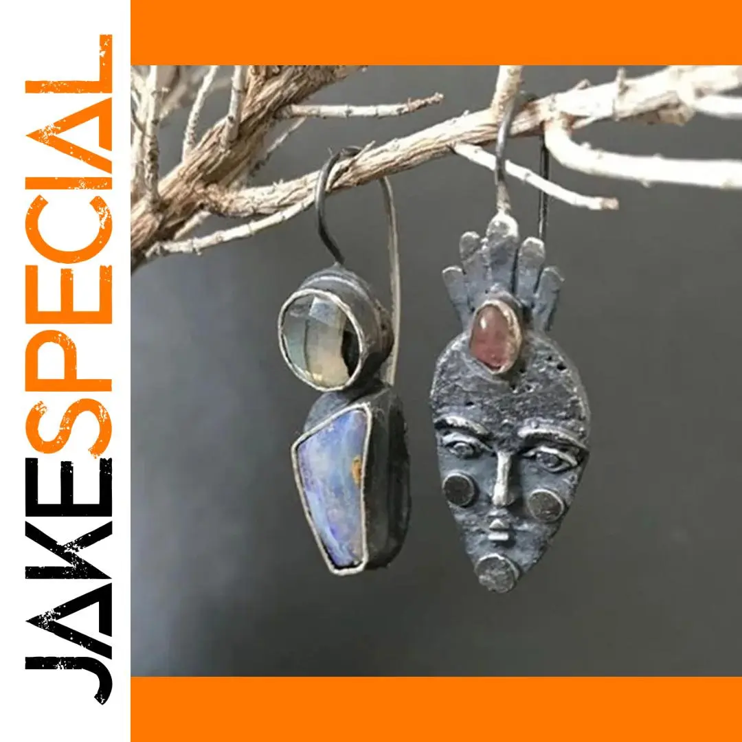 Experience the charm of these vintage-inspired dangle earrings that effortlessly elevate any outfit. Crafted from high-quality zinc alloy, they feature a stunning silver finish that complements their artistic design. The first earring showcases a textured, geometric square face with carved details resembling an abstract or tribal mask, highlighted by a small vibrant red stone at the top, adding a bold splash of color. The second earring offers an organic, elongated shape with iridescent reflections and colorful inlays, evoking a modern, artistic vibe. Both earrings hang delicately from slim hooks, creating beautiful movement. Whether you're at a party, wedding, or daily outing, these earrings will add a touch of vintage charm and creative flair to your look.
