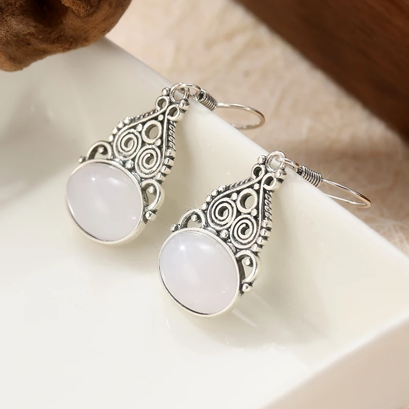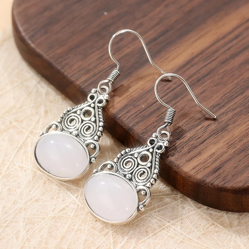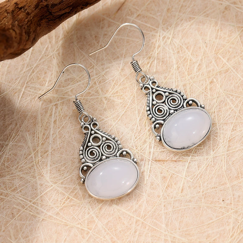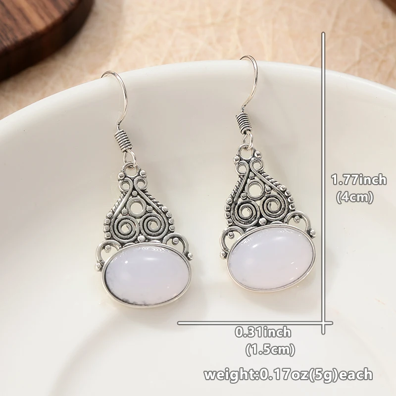 Experience timeless elegance with this pair of vintage-inspired dangle earrings, beautifully crafted from copper alloy with a silver-tone finish. Featuring an ornate oval-shaped metal frame, these earrings showcase delicate openwork patterns and graceful swirling motifs that evoke ethnic charm. The intricate filigree detail is further highlighted by tiny decorative beads along the edges, enhancing their refined, ornamental look. At the bottom, a polished imitation moonstone cabochon with a soft milky translucence and iridescent flashes of blue adds luminous sophistication. Perfectly balanced in size, these earrings are suitable for various occasions—from casual daily wear to special events like weddings and engagement parties. Elevate your jewelry collection with these intricately detailed, versatile accessories.