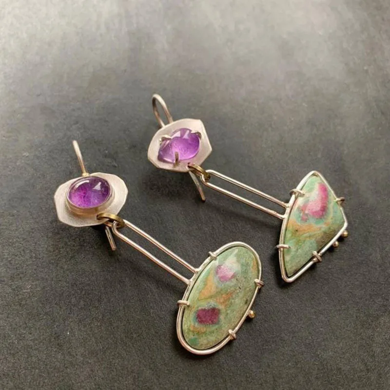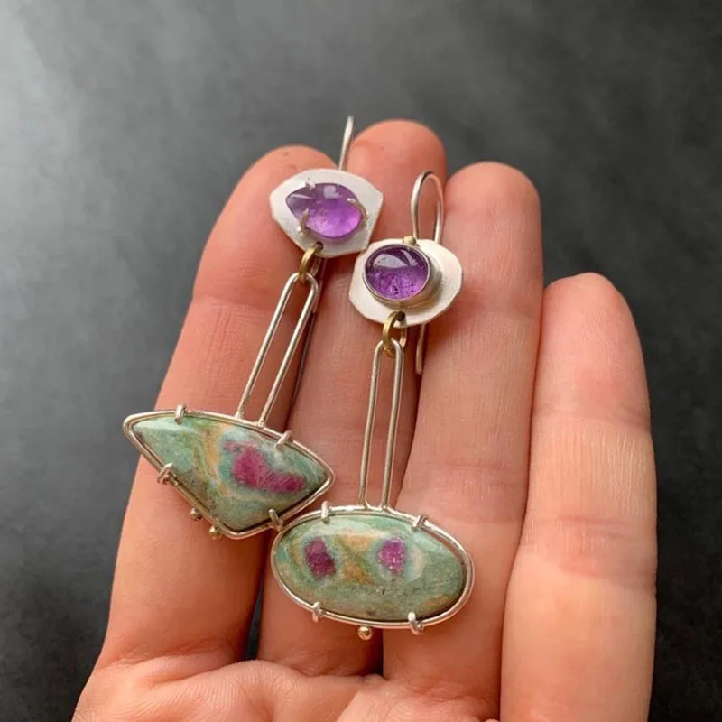 Experience the timeless charm of these vintage-inspired dangle earrings, crafted to enhance your unique style. Featuring a combination of geometric shapes, these earrings showcase a delicate blend of round and square elements, accented by purple stone carvings. Made from lightweight zinc alloy with a silver-colored matte or brushed finish, they provide all-day comfort while adding a subtle touch of elegance. Perfect for any occasion—be it a party, wedding, or daily wear—they effortlessly complement your outfit. Designed to exude femininity and artisanal craftsmanship, these versatile earrings will become your go-to accessory. With their handcrafted look and colorful stones, they radiate personality and sophistication, making every moment special.