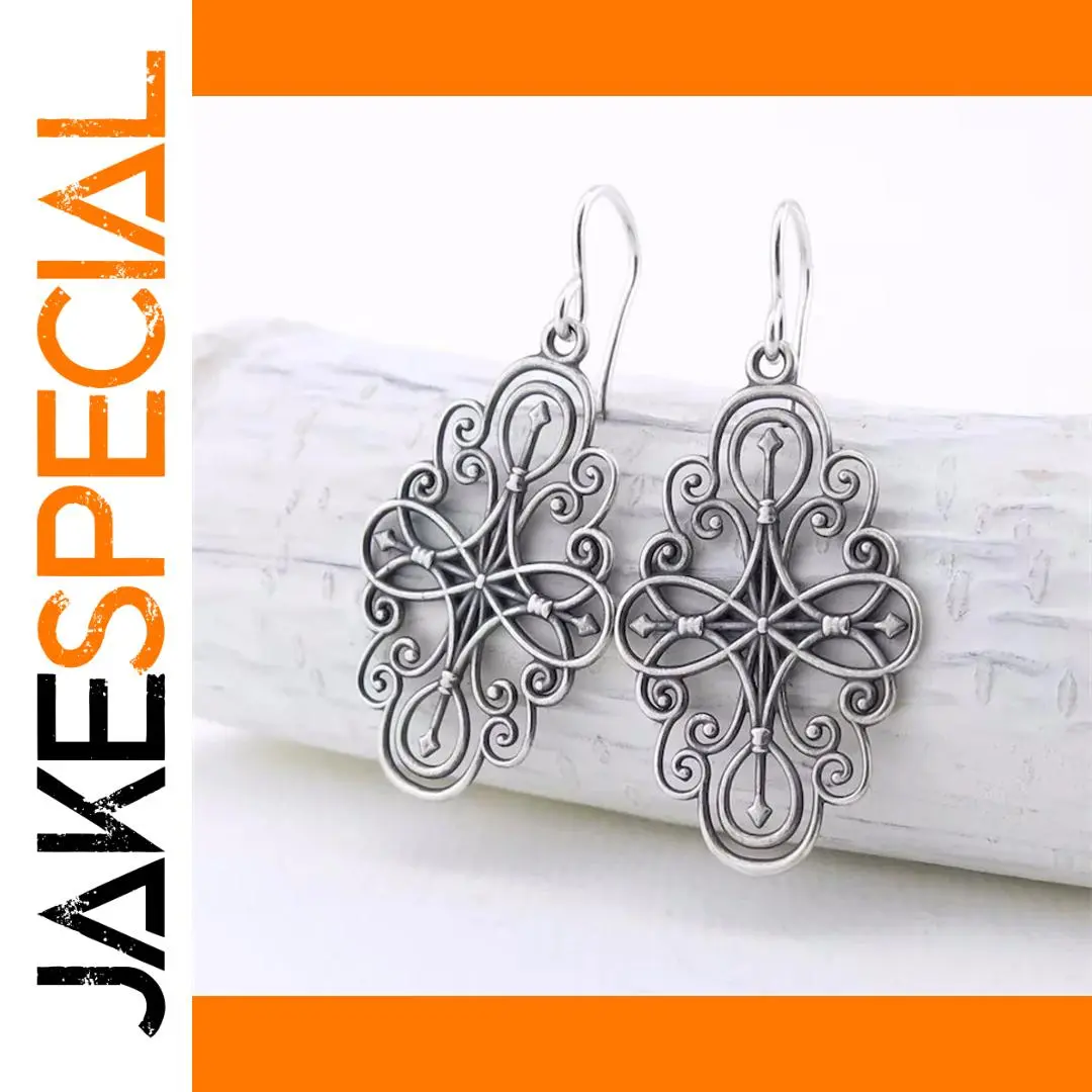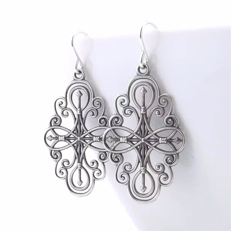 Experience a timeless elegance with this pair of vintage-style drop earrings crafted from zinc alloy, finished in a sophisticated silver tone. These earrings boast an intricate openwork design featuring a harmonious blend of floral and geometric motifs. The delicate swirling lines and circular shapes form a symmetrical, elongated pattern that exudes artistry and refinement. Perfect for women and girls, they add a touch of bohemian charm and artistic flair to any outfit. Whether you're attending a wedding, celebrating an anniversary, or enhancing your daily look, these lightweight earrings provide effortless style and comfort. Their versatile design complements both casual and formal ensembles, making them a must-have accessory in your jewelry collection.
