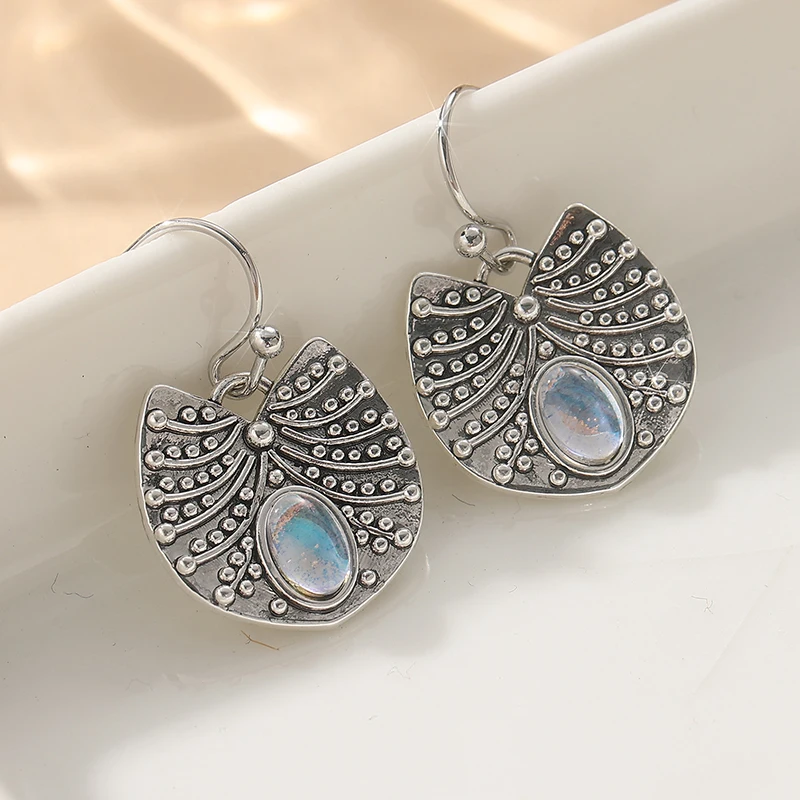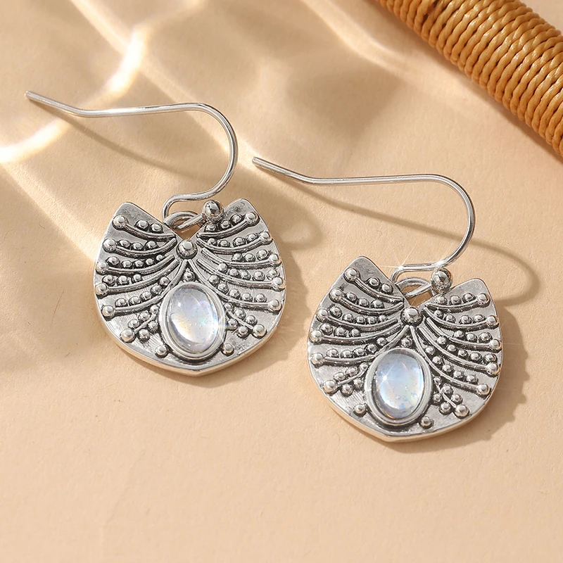 Indulge in the captivating charm of these vintage-inspired silver drop earrings. Visualize yourself wearing them, feeling confident and stylish, whether at a casual gathering or a formal event. Their intricate metalwork and iridescent moonstone create an eye-catching focal point that complements any look. Handcrafted from quality copper alloy with a silver finish, they offer durability and a unique aesthetic. Elevate your jewelry collection with these elegant pieces and enjoy the perfect blend of vintage charm and modern artistry. Add them to your wardrobe today and experience the timeless beauty firsthand.