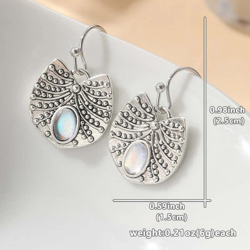 Step into timeless elegance with these vintage-style drop earrings that beautifully combine intricate craftsmanship and artistic design. Crafted from textured copper alloy with a silver tone, these earrings feature elongated oval shapes adorned with delicate, flowing carved lines and dotted accents, creating a vintage geometric pattern. The centerpiece is a smooth, polished imitation moonstone that exhibits iridescent hues of greens, pinks, and blues, adding a luminous touch. Lightweight yet striking, they hang freely from simple, thin hooks, making them comfortable for extended wear. Whether dressing up for a special occasion or adding a touch of vintage charm to casual outfits, these earrings are sure to catch the eye and elevate your style with their intricate details and luminous appeal. They are perfect for collectors and enthusiasts who appreciate artistic jewelry that stands out.