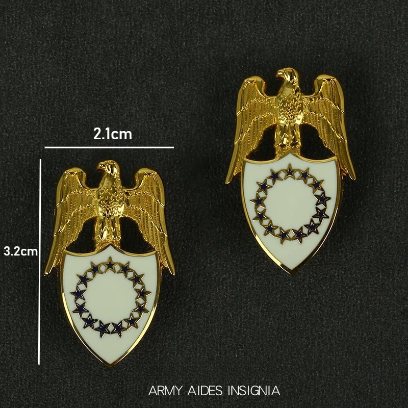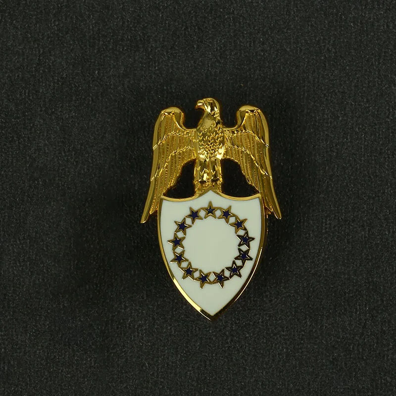 Experience the timeless charm of these decorative metal badges designed for dress and service uniforms. Crafted with a polished, reflective surface, each badge features a stunning gold-colored eagle with detailed feathers and a proud stance, emphasizing craftsmanship and regal style. Beneath the eagle, the shield-shaped centerpiece showcases a contrasting background—white with a black border or deep blue with a matching border—adding a touch of sophistication. A circular ring of eleven gold stars with dark accents around the shield enhances the emblematic appeal, evoking a nostalgic European aesthetic. Perfect for costume enthusiasts, collectors, or decoration projects, these badges bring a vintage yet refined look to any collection.