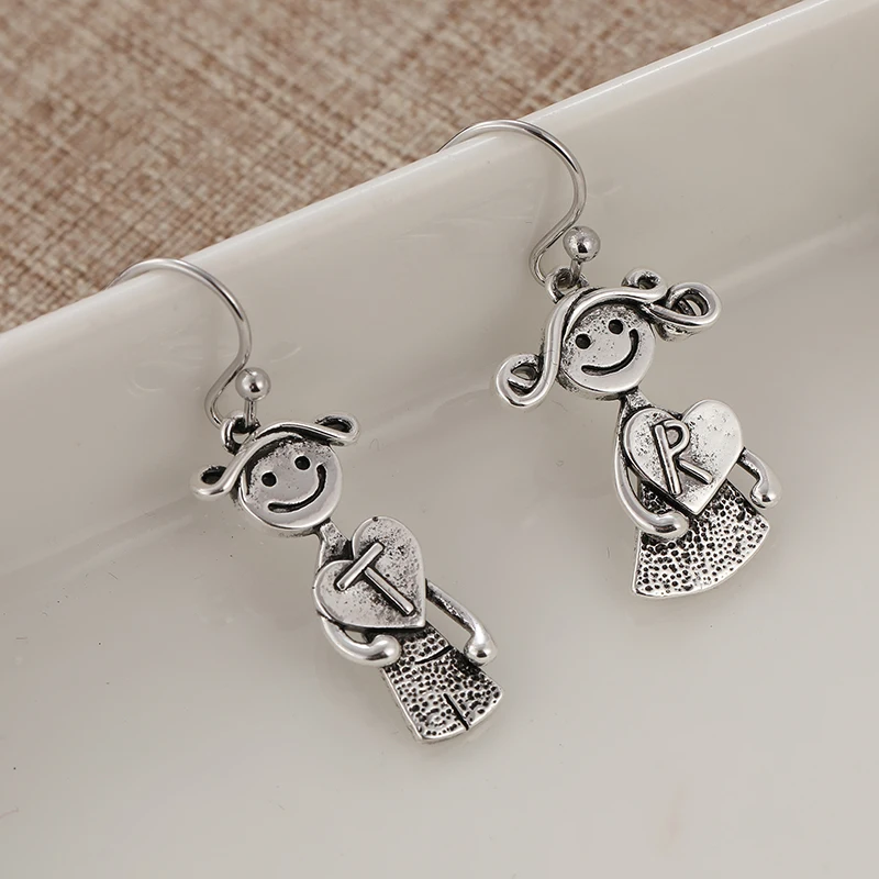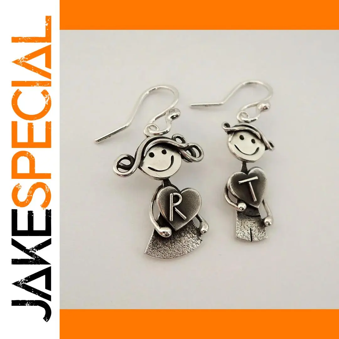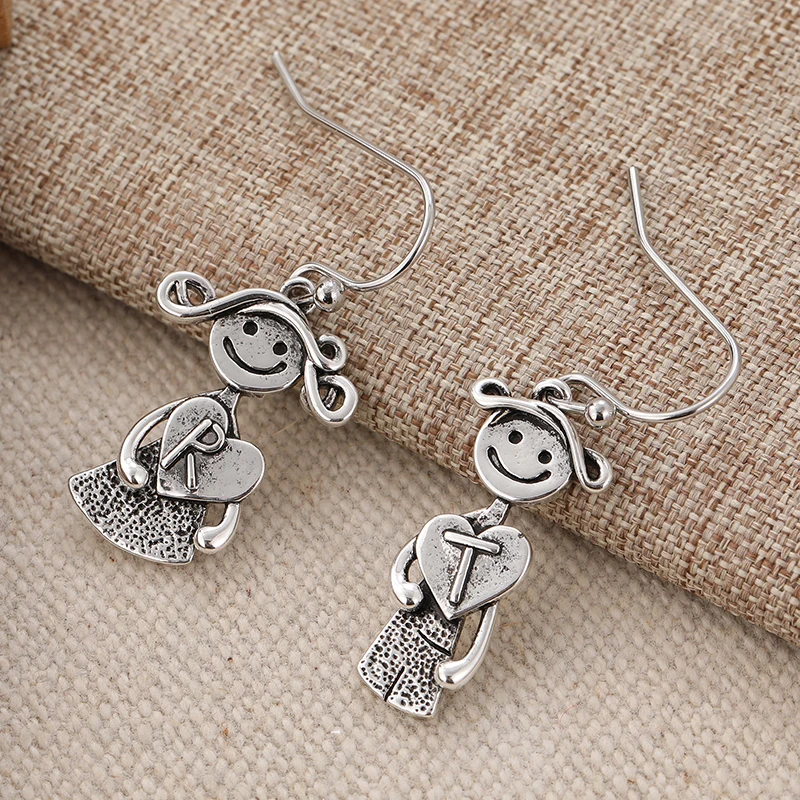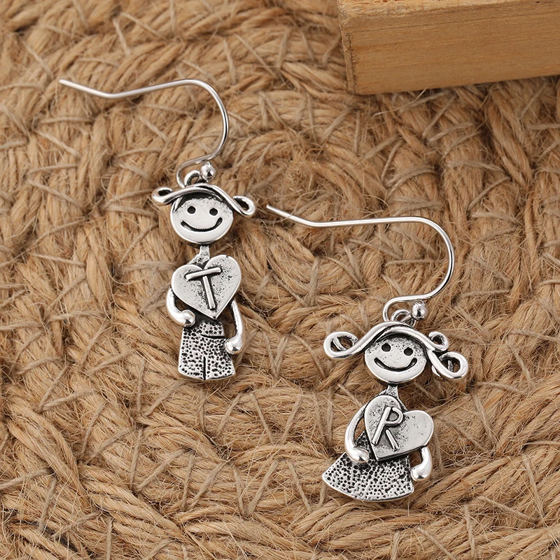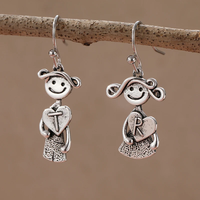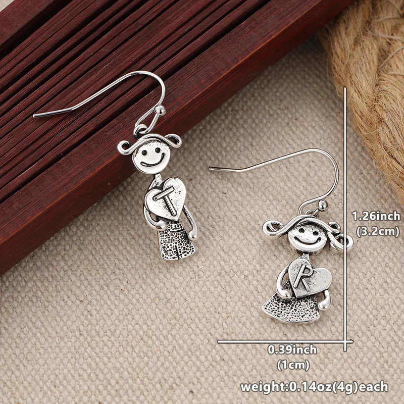 Step into a world of playful elegance with these vintage-style drop earrings crafted from high-quality copper alloy in a stunning silver-tone finish. Designed to evoke nostalgia with a modern twist, they showcase whimsical, cartoon-like girls holding heart-shaped pendants engraved with “R” and “T.” The intricate geometric shapes and textured skirts add depth, while the wire-like hair design offers a charming, whimsical touch. Perfect for enhancing your beauty on special occasions such as weddings, engagements, parties, or everyday wear, these earrings express your unique style effortlessly. Lightweight and comfortable, they easily complement any outfit, making you feel confident and charming every day. Imagine yourself wearing these delightful accessories and catching admiring looks wherever you go.