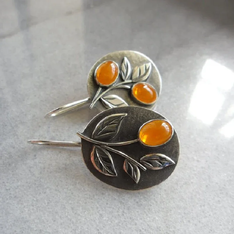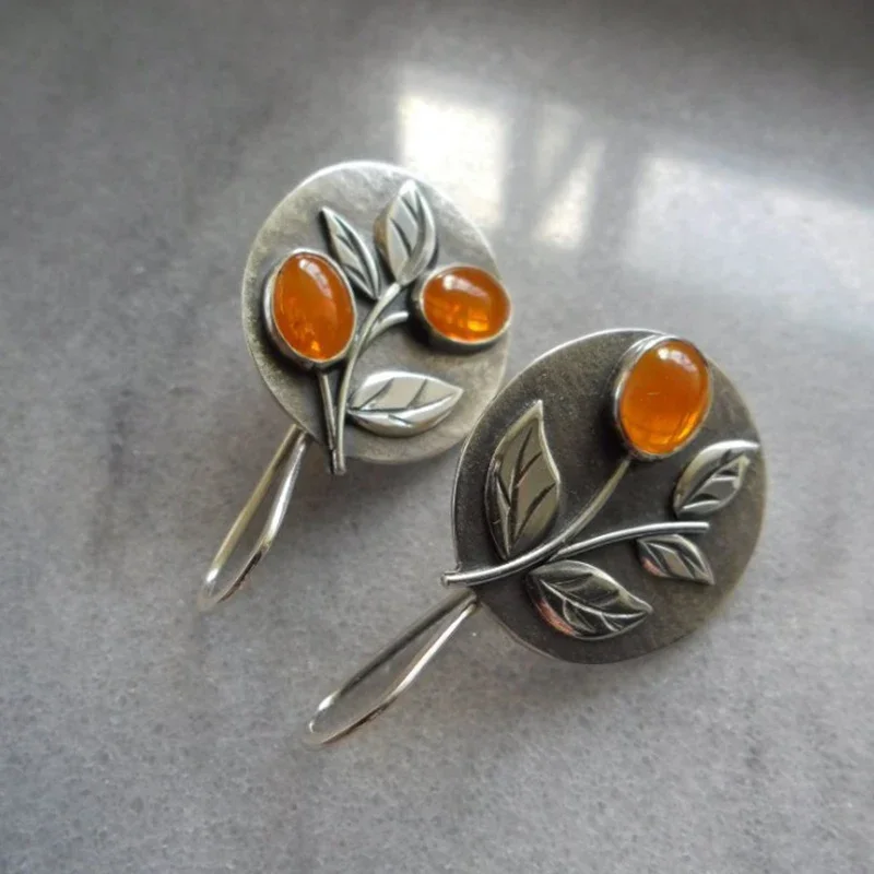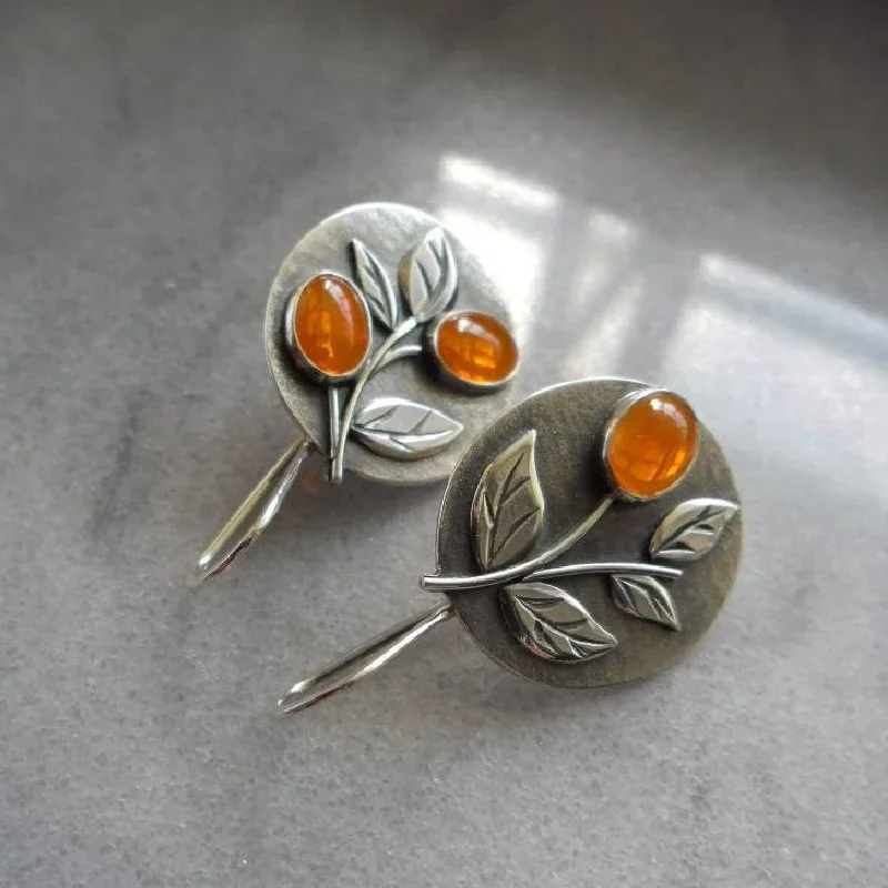 Imagine adding a touch of vintage elegance to your jewelry collection with these beautifully crafted drop earrings. Designed with intricate leaf details and a subtle textured silver-tone finish, they showcase a delicate oval shape. Each earring features an eye-catching, polished orange stone at the tip of a slender, curved stem, bringing a vibrant pop of color against the matte background. Their refined yet organic style makes them perfect for various occasions like parties, weddings, or daily wear. They are lightweight, measuring approximately 1-2 centimeters, so you’ll enjoy wearing them comfortably all day or night. Let these earrings bring your outfit to life, adding a sophisticated, nature-inspired flair with every wear.